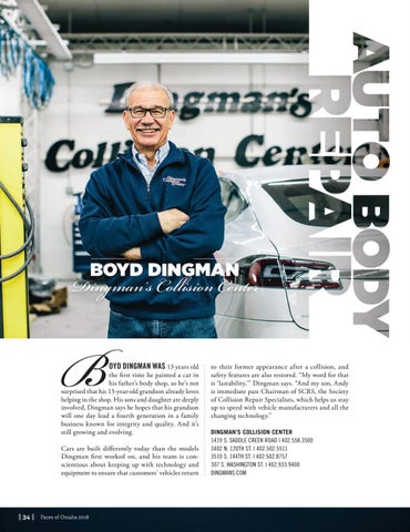 to their former appearance after a collision, and safety features are also restored. “My word for that is ‘lastability,’” Dingman says. “And my son, Andy is immediate past Chairman of SCRS, the Society of Collision Repair Specialists, which helps us stay up to speed with vehicle manufacturers and all the changing technology.” DINGMAN’S COLLISION CENTER 1419 S. SADDLE CREEK ROAD | 402.558.3500 3402 N. 120TH ST. | 402.502.5511 3510 S. 144TH ST. | 402.502.8757 307 S. WASHINGTON ST. | 402.933.9400 DINGMANS.COM