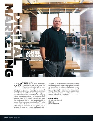 Duran and his savvy team figure out customized solutions for a company’s marketing needs and approach everything from the mindset of a business owner. Effective marketing solutions are not one-size-fits-all. “We care about what it is that makes our clients tick, where their pain points are, and where we can build solutions to help them,” says Duran. KREATIVELEMENT 1111 N. 13TH ST., SUITE 307 402.557.5894 KREATIVELEMENT.COM