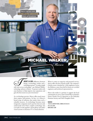 When it comes to expertise and personal service, Marco offers the best of both worlds. The company’s Omaha team is backed by 1,100 employees across the Midwest, more than half of whom are certified engineers and technical representatives. Marco also makes it a priority to support the local communities we serve, from United Way to Omaha’s Henry Doorly Zoo & Aquarium to the Nebraska Humane Society and Vala’s Pumpkin Patch. MARCO 7929 W. CENTER ROAD, OMAHA, NE 68124 402.339.3006 MARCONET.COM
