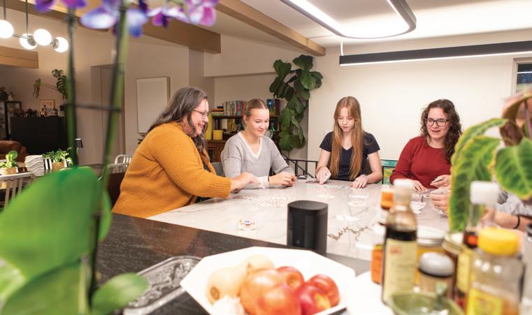 The L-shaped island with grayveined quartzite conceals extra shelves below for a microwave that doesn’t see much use for this “ingredient family,” meaning Laura and Chris encourage their children to make meals from scratch rather than prepackaged produce. Since all of them love LaCroix, they enjoy the sparkling water dispenser for a chill, bubbly drink after school or work. If not chatting around the island, the dining room table extends to accommodate visitors. Chris and Laura consider some of the furniture, like the table, “a placeholder,” since neither has agreed on future purchases.