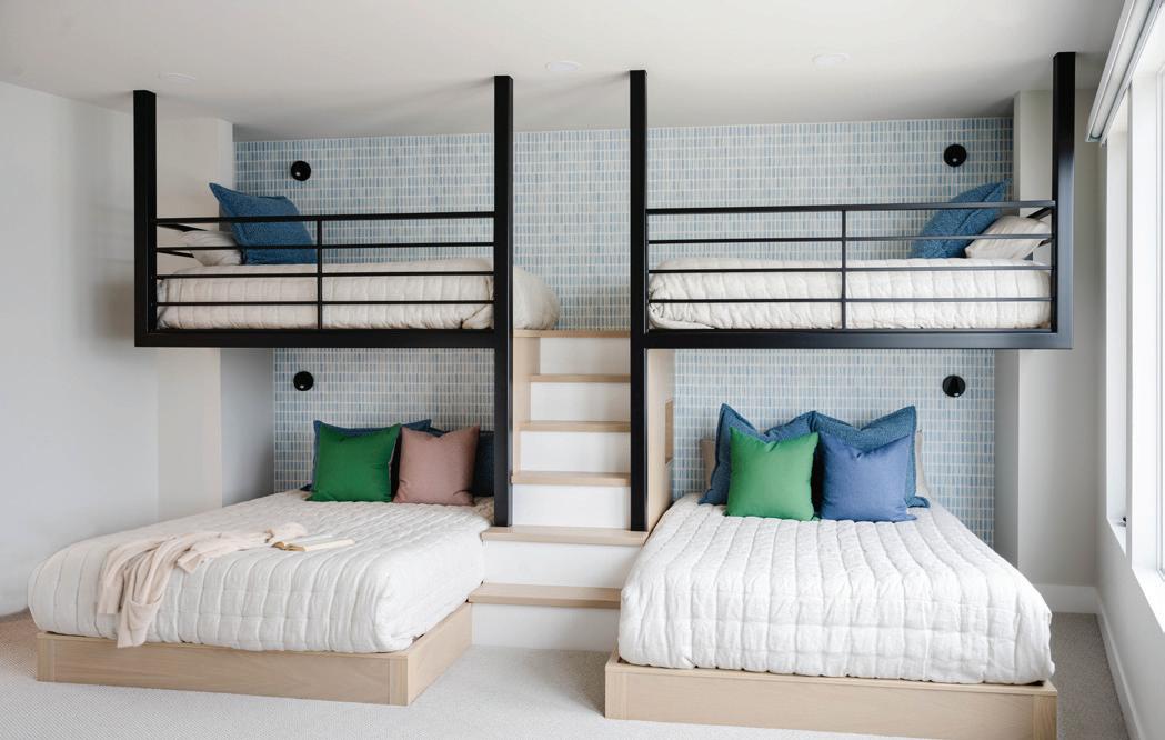 During the conceptual design phase, the team worked closely with the homeowners to define a cohesive vision, exploring imagery and design direction that reflected their lifestyle and the home’s lakeside setting. The architecture presented distinctive challenges, with custom angles throughout from the pie-shaped lake room to the intentionally non-square bunk layout requiring both creativity and precision.