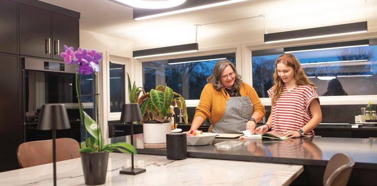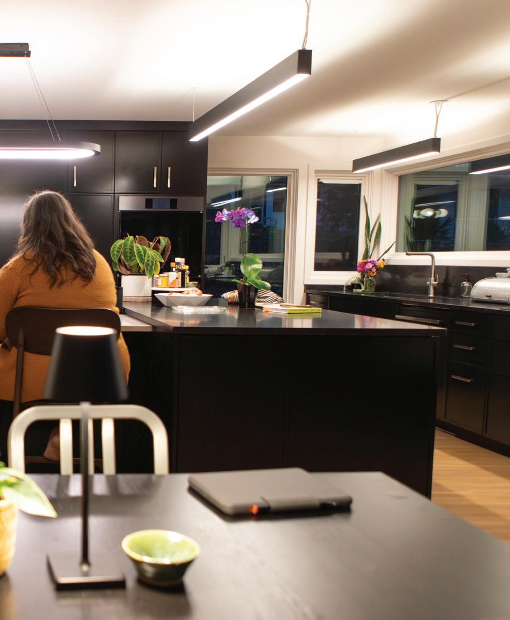 ter installing an easy-to-clean flat induction stovetop. Honed misty-black granite countertops spread out with enough room to chop mushrooms for the Professional Remodeling Organization’s chili cook-off. A dual pull-out conveniently separates recycling and trash, simplifying the meal preparation.
