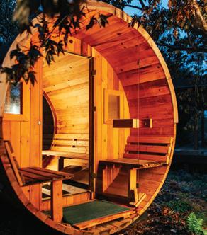 The outdoor area features a hot tub, a lounging area with a fire pit and gathering space, and a cold plunge. Outside the pavilion is a standalone sauna. Retractable screens are built into the structure, with small, round lighting installed in the ceiling. The landscape runs underneath the pavilion, so there isn’t a distinction between where the landscape ends and the structure begins. The result is an incredible outdoor spa retreat.