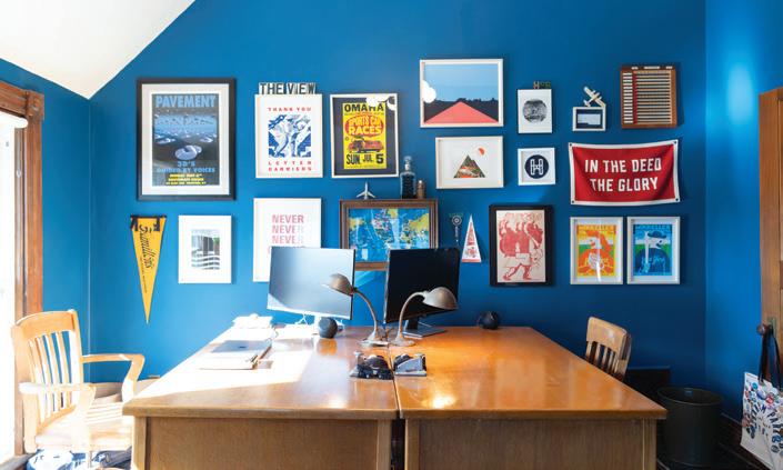 Lueninghoener’s workspace is housed in a bright purple home he bought in 2023, the dedicated home base of his graphic design business, Hanscom Park Studio. In a light blue house with pink trim next door, Noser settles into her own office each day.
