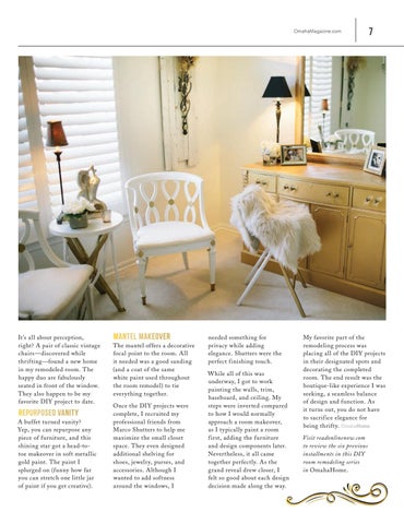 My favorite part of the remodeling process was placing all of the DIY projects in their designated spots and decorating the completed room. The end result was the boutique-like experience I was seeking, a seamless balance of design and function. As it turns out, you do not have to sacrif ice elegance for being thrifty. Visit readonlinenow.com to review the six previous installments in this DI Y room remodeling series in OmahaHome.