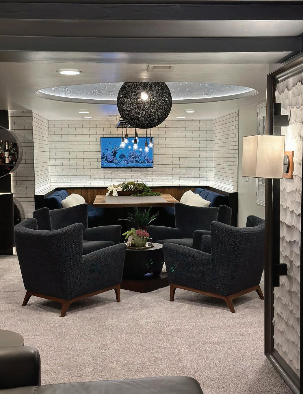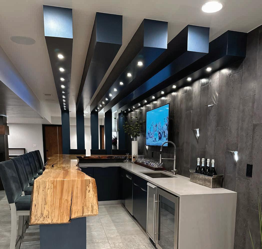 The color palette was to be warm and inviting but also very easy to maintain. The bar top was made from hand-picked slotted maple slabs, then black filled and coated with epoxy. The metallic blue beams above make the space intimate, yet fun to hang out in with friends. The custom barstools can go back and forth between the two countertops depending on which television residents and guests want to watch. The bar front is made of hair-on-hide with large metallic half rounds that achieves an eyecatching pattern. The backdrop wall of the kitchenette is Ann Sacks black concrete tile, and the matching accent tile was strategically placed with the corner bent back with added LED lights to accentuate the wall in a balanced pattern.