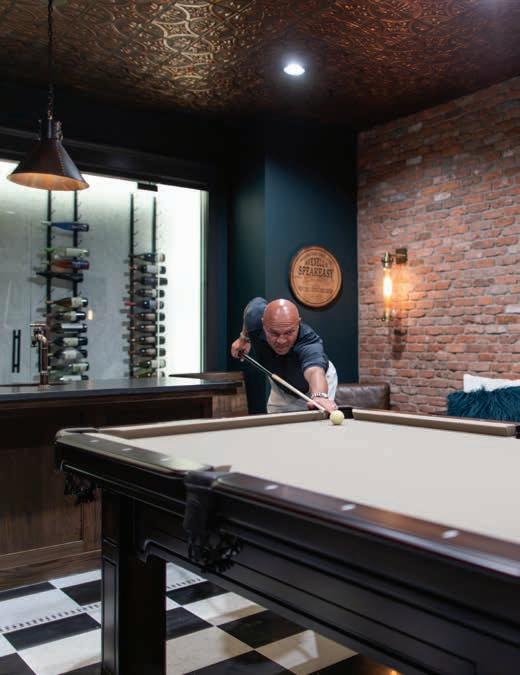 The open-concept home includes many high-end finishes and design features that suit their stage of life and snowbird lifestyle, including built-in closet cabinetry for out-of-season clothes, a zero-entry shower and flooring throughout, and a basement pool table, card table, and guest suite for visiting friends.