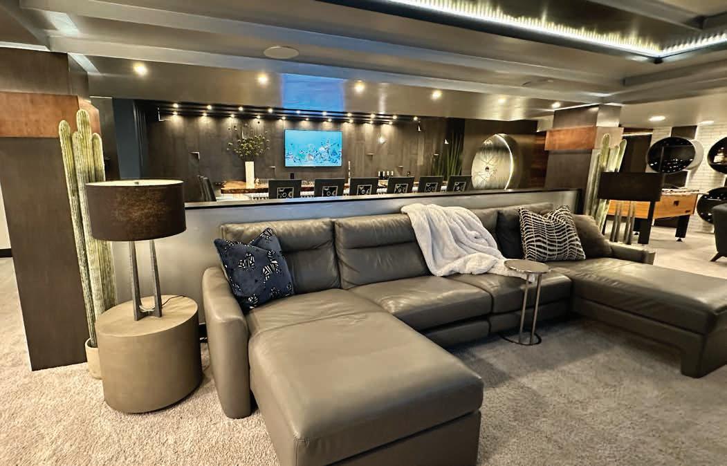 The banquette was made to fit into the new alcove of what once was the entrance to an office. The large bespoke table is made with ostrich leather and hair-on-hide mitered border. The navy velvet couches were elevated with a custom-built stacking base fashioned from mahogany wood. The light fixture was custom made with wrapped pendants, making it a cozy corner in which to play games. The custom metal wine racks showcase their collection and help break up the space while connecting the arcade into the basement.