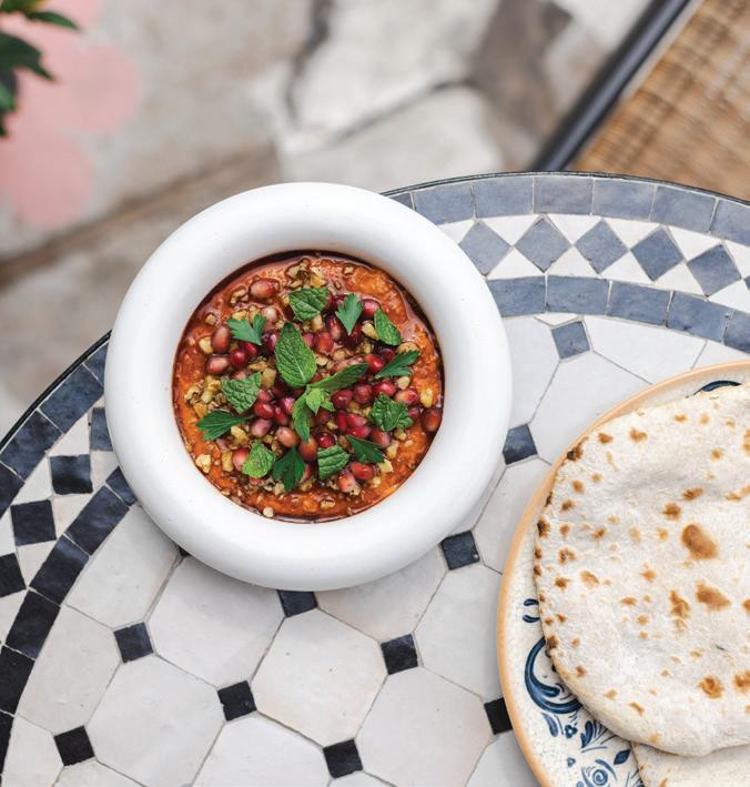 The front bar features a terrazzo countertop and a canopy of vines and flowers overhead, as blue-and-white striped archways lead into the open dining room—here, niches along the walls are adorned with handmade pottery and artifacts. The standout of Clio’s interior is the trio of seafoam green semicircle booths, all surrounding a tree of vines and flowers that cascade across the ceiling. Smaller tables with wicker chairs are a more intimate seating option to ensure every spot in the house is a great one.
