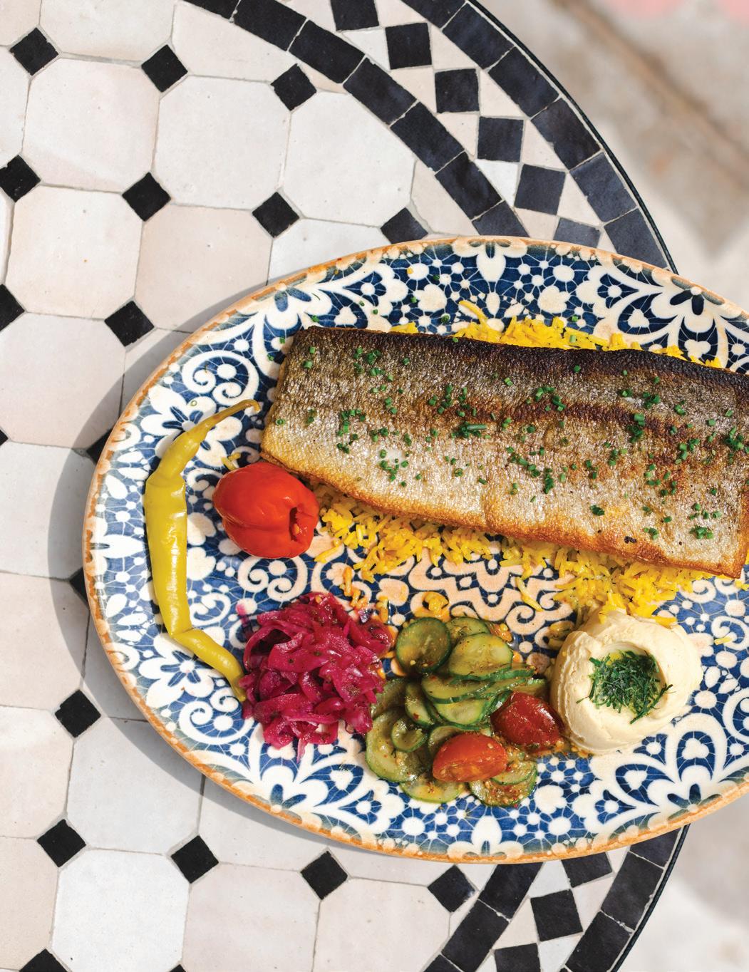 In keeping with the sharing tradition of Mediterranean cuisine, we split one large plate from the menu: the chicken kabob. The kabob was tender and seasoned expertly with Mediterranean spices without overwhelming the overall taste. Accompanied by a bed of saffron rice, a fresh cucumber and tomato side salad, peppers, tzatziki, and hummus, each side component complemented the next. The chermoula, red onion, and dill that topped the kabob truly took it to the next level—even with the shared plate, we were more than satisfied with the portion sizes.