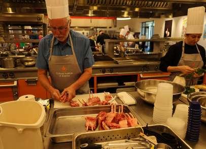 Each team had one chef to tutor them. Everyone had numerous questions about preparation and technique. I discovered I had been using the wrong technique to wield a chef’s knife my entire life. The correct way is to use a pinch grip where your thumb and index finger grip the blade near the bolster (heel) but before the handle, then the other fingers curl around the handle. This provides better accuracy, speed and control. It also promotes safety because your chances of slipping are decreased. We were shown how to put small slits on the skin side of salmon before cooking to keep the skin lying flat. Wife Mary and I were assigned risotto, and I learned the proper way to clean morrells. Not with running tap water but gently soaking them in water about 3 times. It was surprising how much sand fell to the bottom of the soaking pan. How to tie up two rack of lamb and cover the “Frenched” portion (bare bones where the meat had been scraped off) with tin foil to keep it white. And much more.