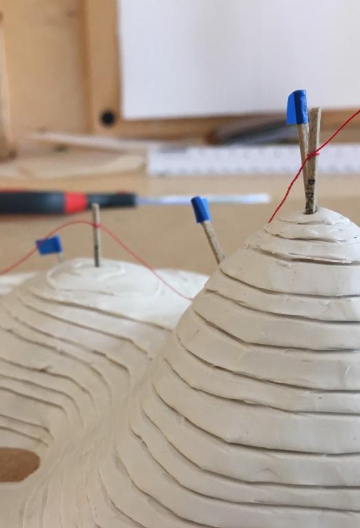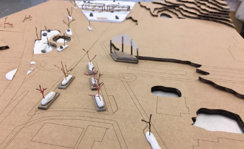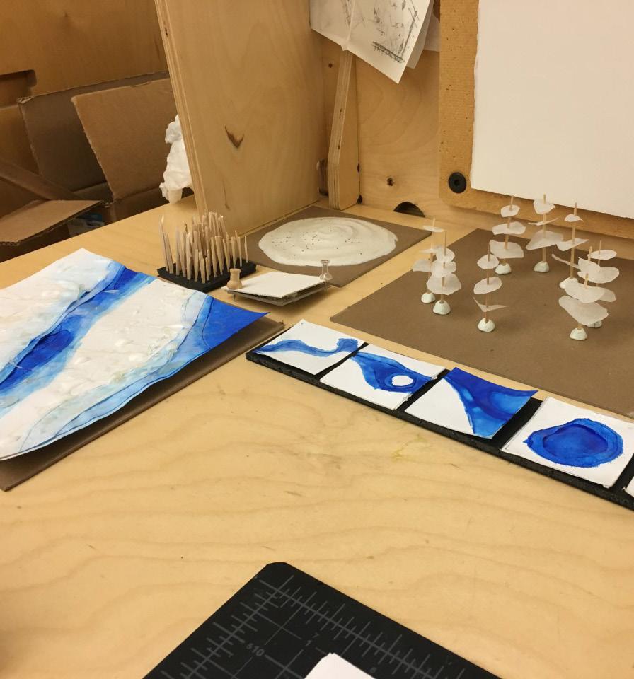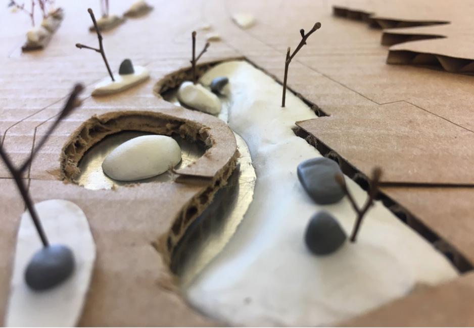 Some of the most interesting explorations I’ve had, have been in working with materials to represent ideas more than just in a 2D form. I’ve used scraps and recycled materials to mock up concepts like a pedestrian bridge, topography, plaza spaces, bus stops, and more large scale features in the landscapes I’m designing. I’ve also spent time working on different contraptions and tools to give the models a desired look or feel. Working to represent textures and colors in this 3D range has me scouting out different items and paying close attention to what can be re-purposed to look as aesthetically clean as a final project.