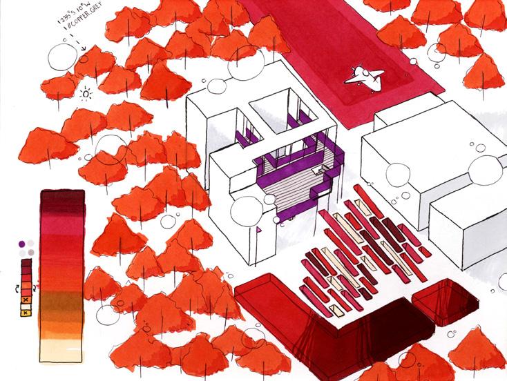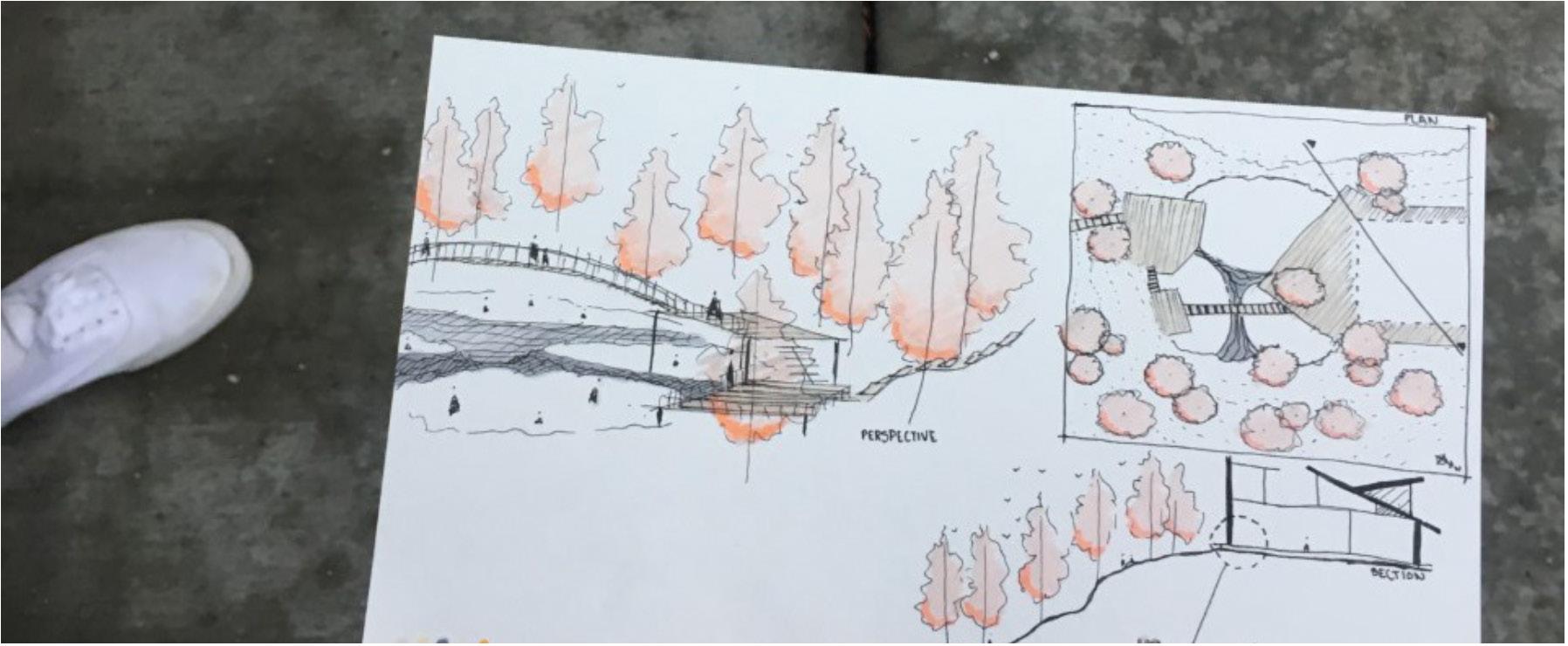 Using skills like annotations and organization also allowed for the project to flow smoothly between teammates and moments to step away from the project and return to a project easily. Practicing simplicity, white space, and color theory to help promote design elements also gave me the core skills to build up a consistent design language. Used budgeting + GIS skills in my Urban Planning course to consider the effects the hand drawn plan would effect the site due to certain uses | surface area permeable material.
