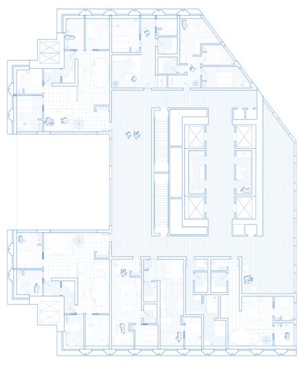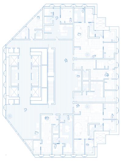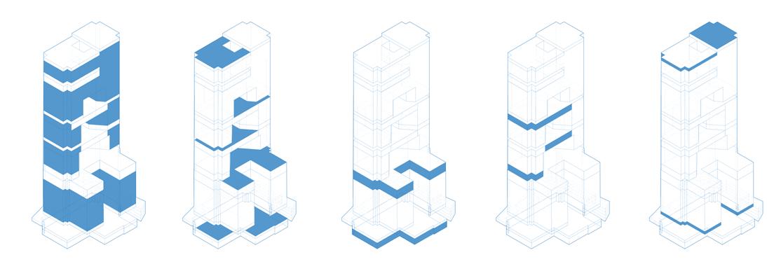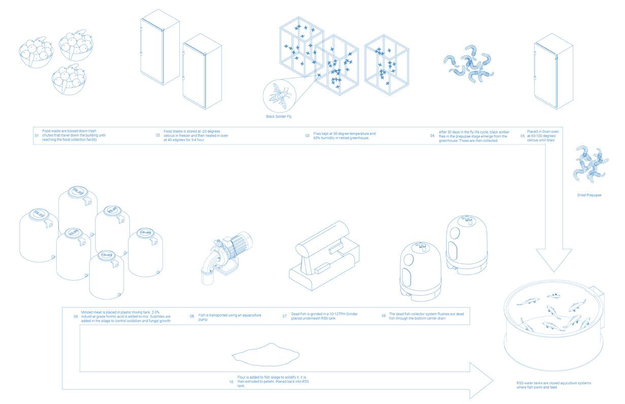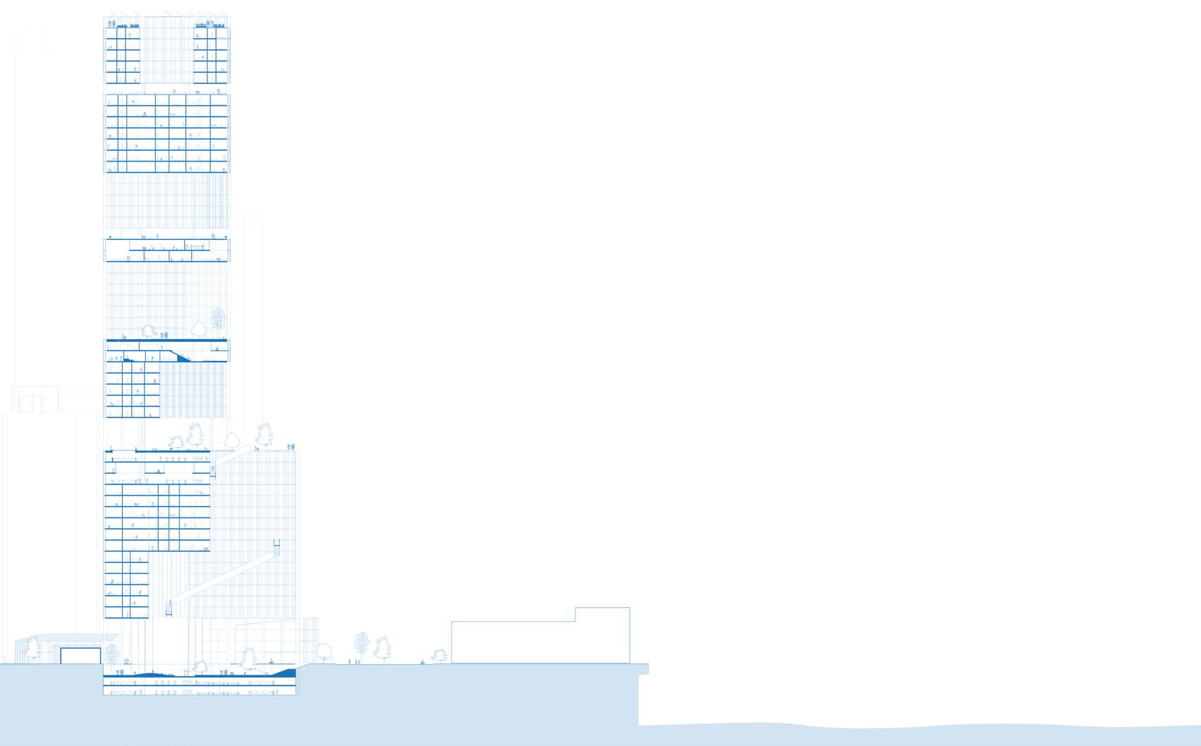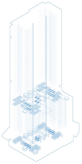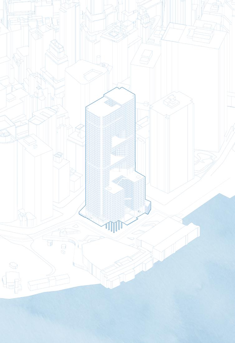 This office to residential conversion at the heart of New York’s Financial District aims to use water as an element of change and rethink how we should inhabit skyscrapers. The ground floor embraces the flood as a resiliency tactic by creating a public space for water collection and a park when the flood is not present. Community activities are dispersed in the terraces and invite the public to explore the city vertically. The public housing units are subsidized through an aquaculture research system that utilizes the building’s plumbing and waste to generate fish. The redesign respects the iconography of the existing building and uses voids to suggest a possible future for skyscrapers and their responsibility to the larger urban context.