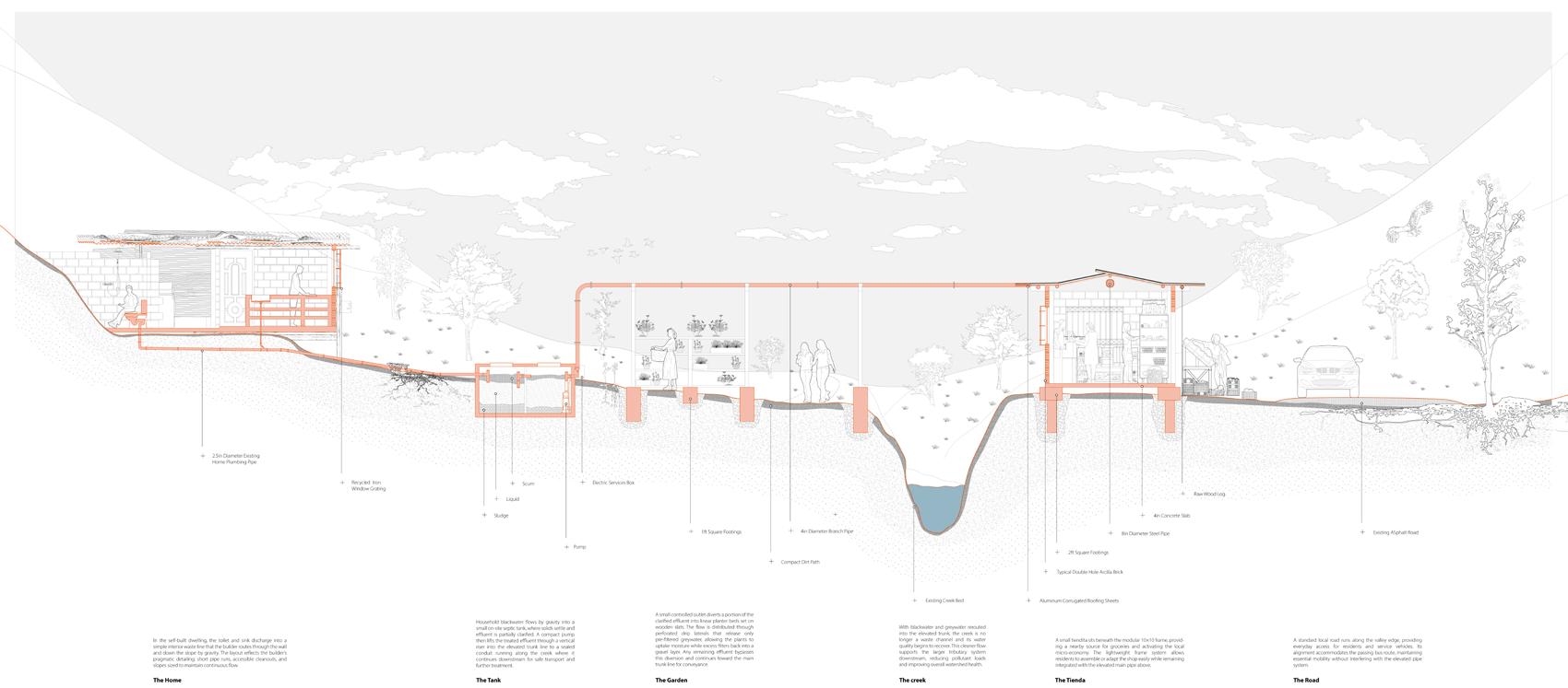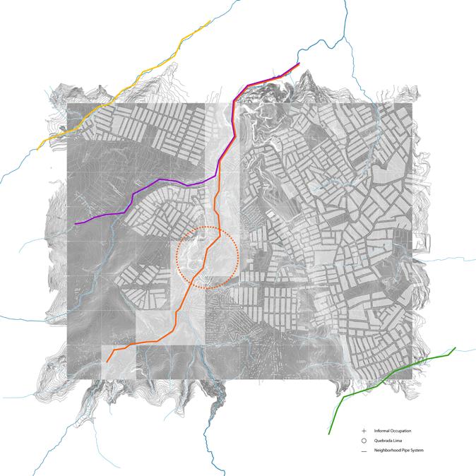 Focusing on the Quebrada Lima corridor, the project analyzes how water infrastructure can be reconfigured to address environmental risk while supporting everyday life at the household and neighborhood scale. By tracing the movement of wastewater, circulation, and material across the slope, the thesis situates architectural intervention within existing practices of construction and maintenance. Rather than proposing a finished solution, the work operates as a framework for incremental change, engaging informality as a productive and adaptive mode of urbanization.