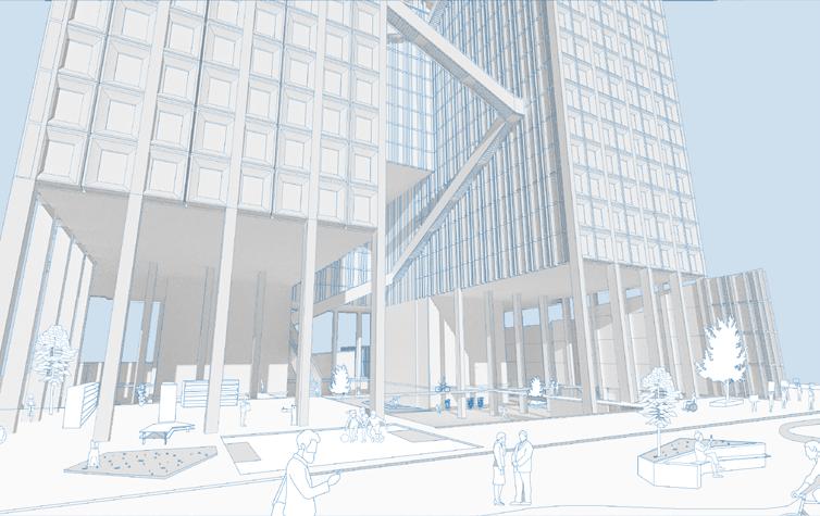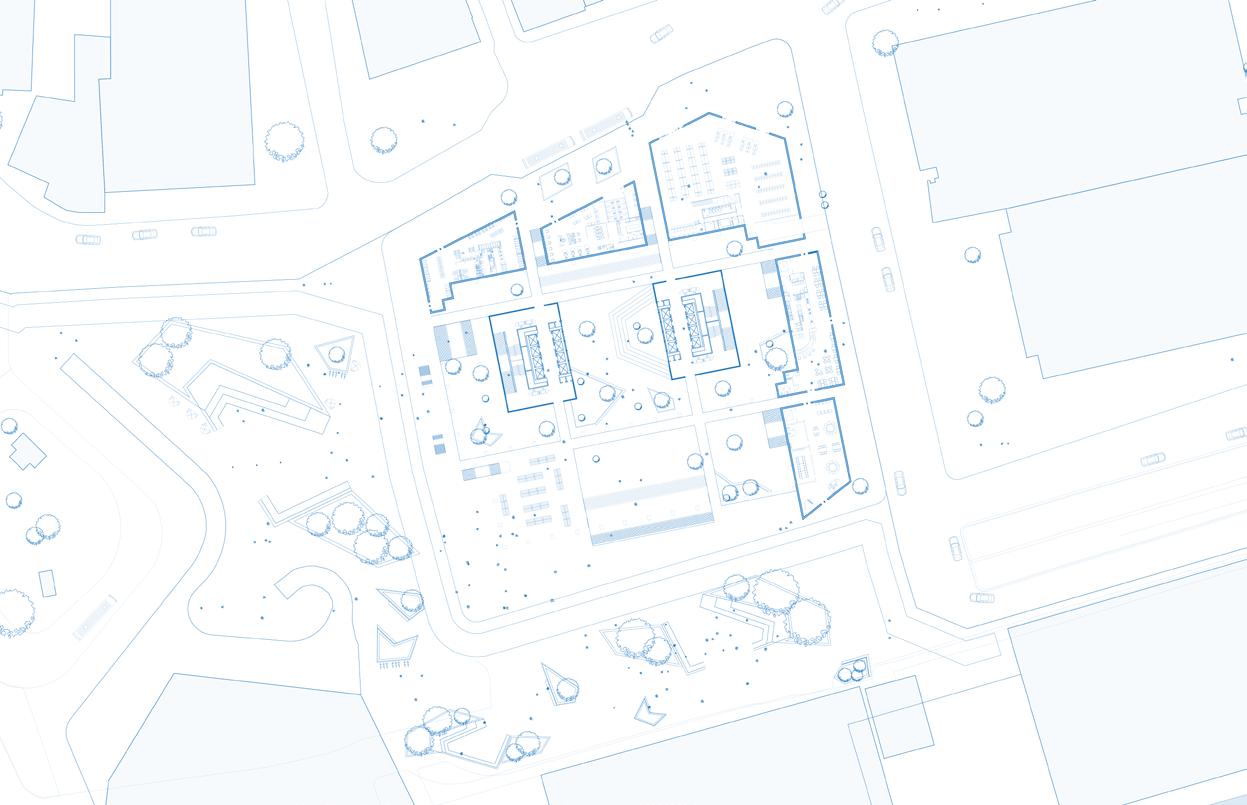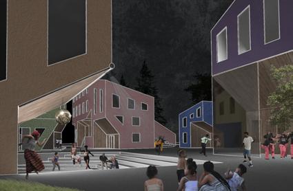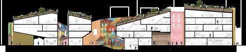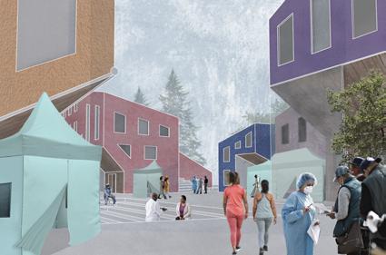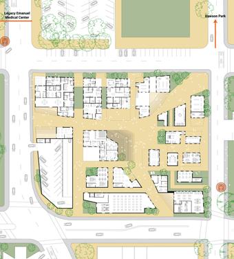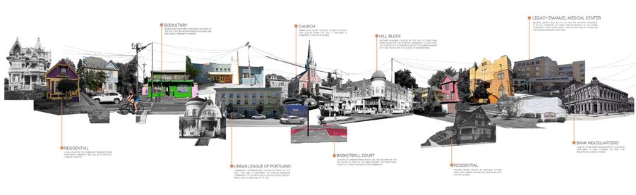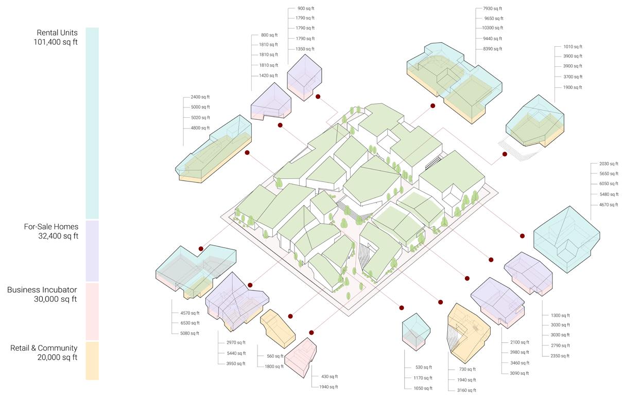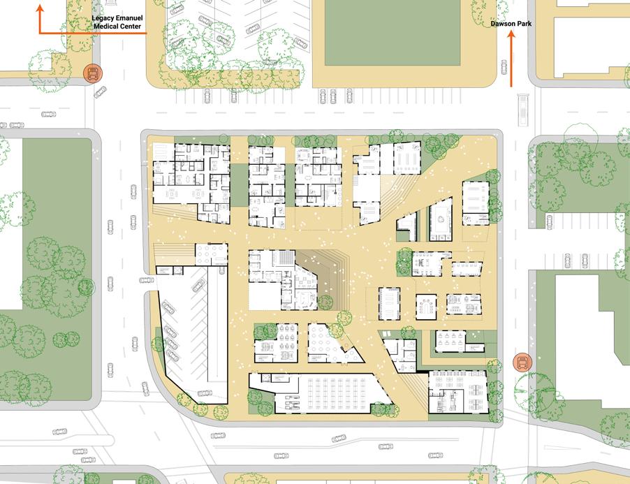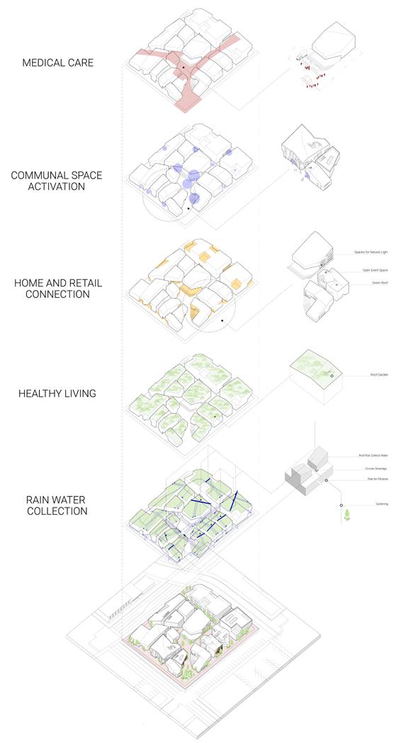 In order to heal Albina’s fractured history, the mixed used block weaves a new tapestry into the landscape. Five healing pillars serve as the foundation of the design: medical health emerges in community spaces and building facades, healthy lifestyles are promoted through green roofs, resilient environmental systems can be seen through angled roofs for rainwater collection, and vibrant residences engage with businesses.