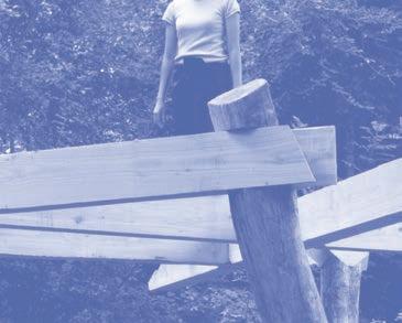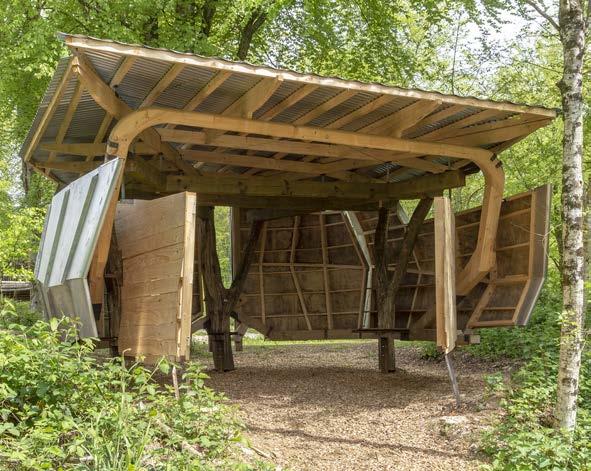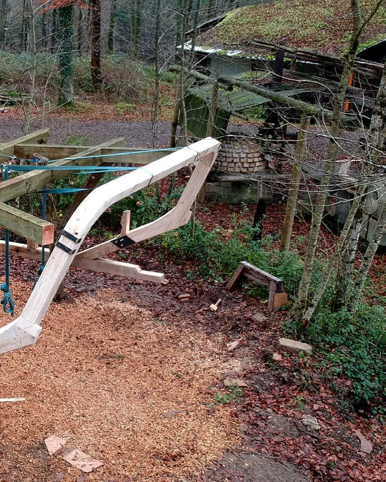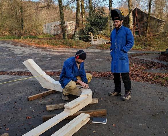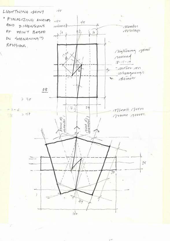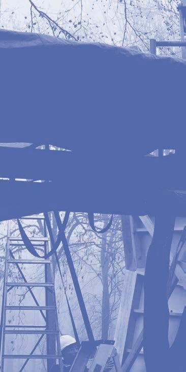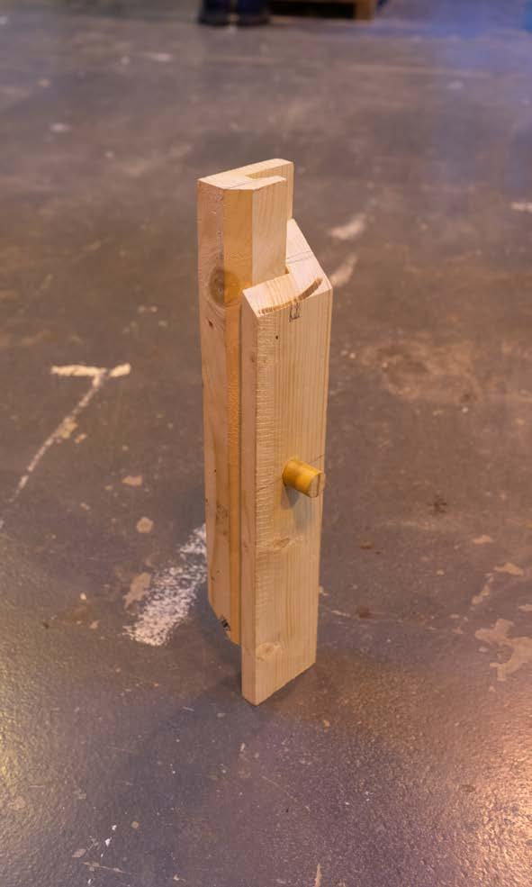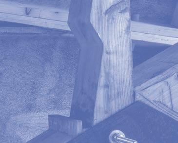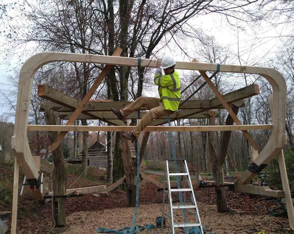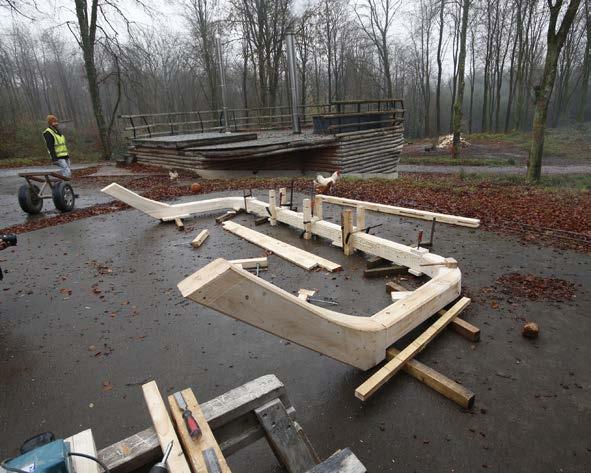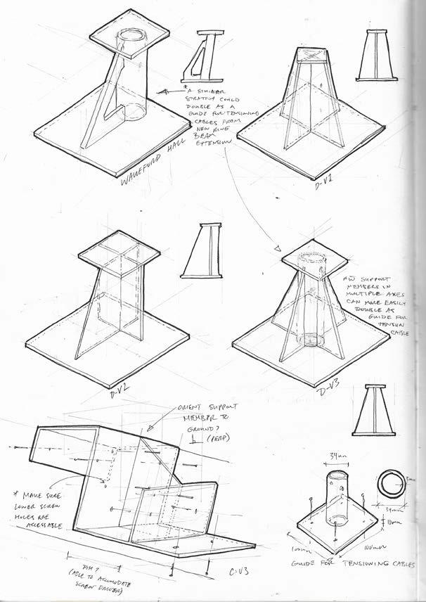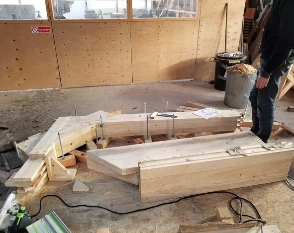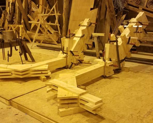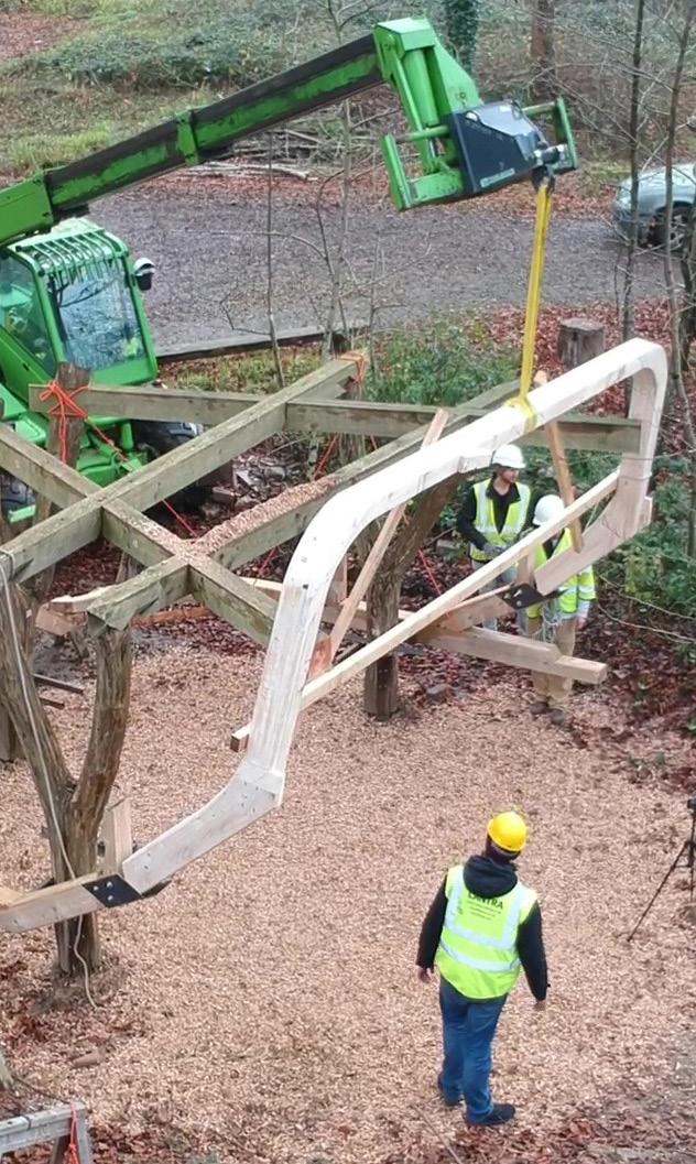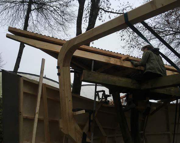 and maintain e ective grain direction throughout it was decided to use two lamination directions. These were timber jointed at four distinct locations. The rst two consolidating the transition between the rotation and the upward movement in the larger lapped connection at the lower part of the beam, and the second two connecting the top at with ngers joints, part of the way past the bend to minimize the moment stress on the joint. Once fully assembled it was lifted into place into two steel brackets at the lower part of the beam, connecting to the existing ring beam, and two larger steel appendages extending outwards from the existing Douglas r roof beams. Finally, a central tension cable ran from the centre of the ring beam extension along with the original forked members down to the front of the inherited ring beam.
