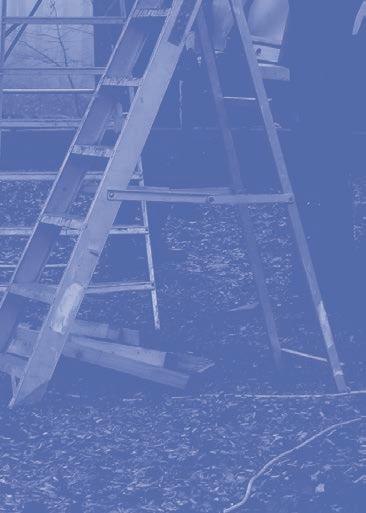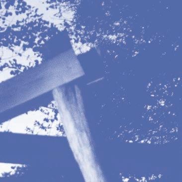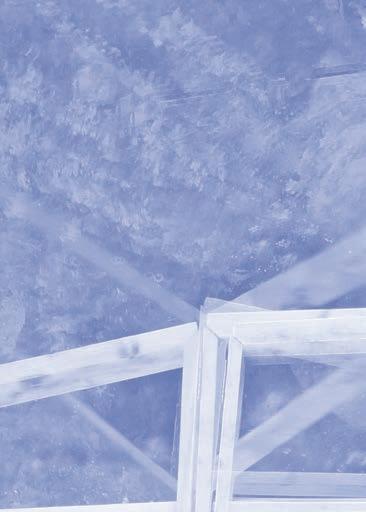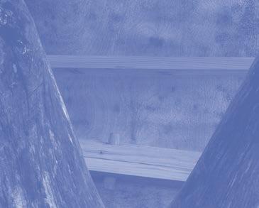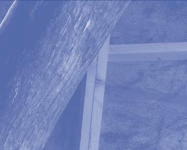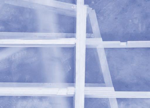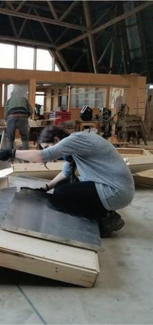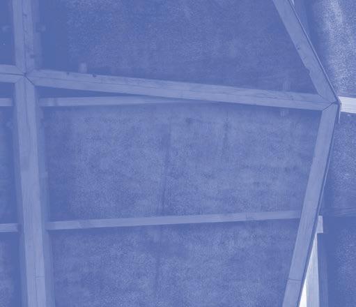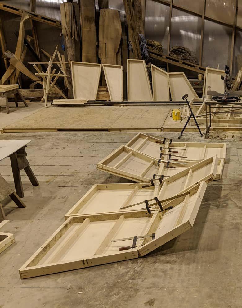 quite well in its amenability to any potential purlin arrangement and the directing of water by the corrugations. Secured using stock fasteners the edge details were cut using an orbital grinder following application to the frames. In this way, any irregularities in timber component fabrication or assembly could be easily mitigated. While the two smaller roof frames were installed with little complication by way of securing strops to underlying timber supports and lifting them into place the larger roof section proved more di cult. This uppermost frame nesting within the other two, it could not be lifted into place using similarly overstanding supports. Instead, 3 releasable I-bolts were strategically drilled into the frame, acting as anchors for the strops and thereby allowing the frame to be lower into position with little con ict.