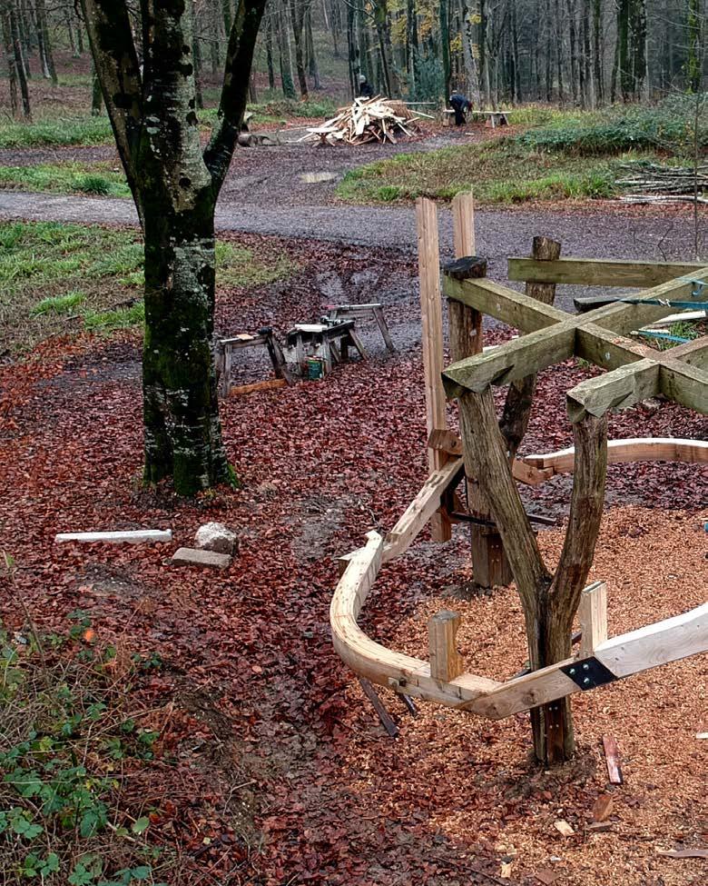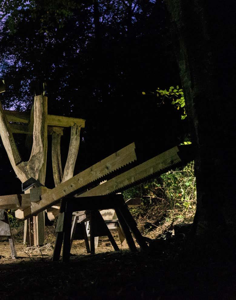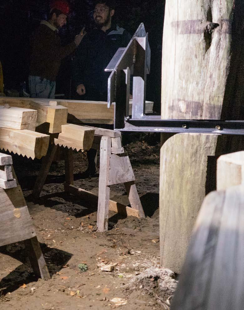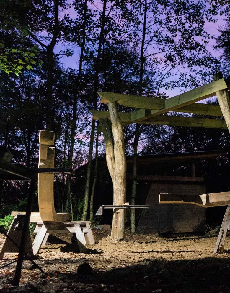 Our assignment for the induction and core studios is Act III of the Foundry. We inherited a site developed through two previous acts as part of the Robotic Fabrications visiting school. The Chainsaw Choreographies in 2016 produced a composition of three standing beech forks connected by a series of douglas r beams, and the Bandsaw Manoeuvres