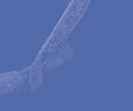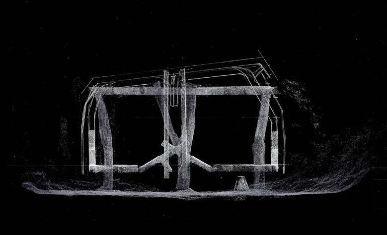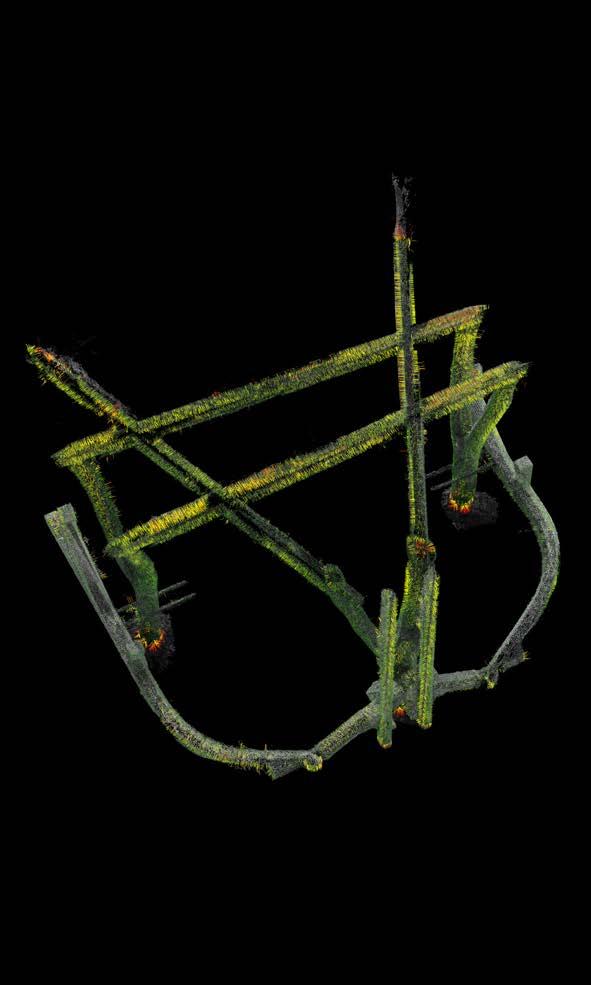 This generates a point cloud that is measured against the digital reference model used to fabricate the ring beam and forks. The amount of de ection is recorded and cross-checked with a measured survey. This allows for corrections in the modeling and locating of the wing panels.