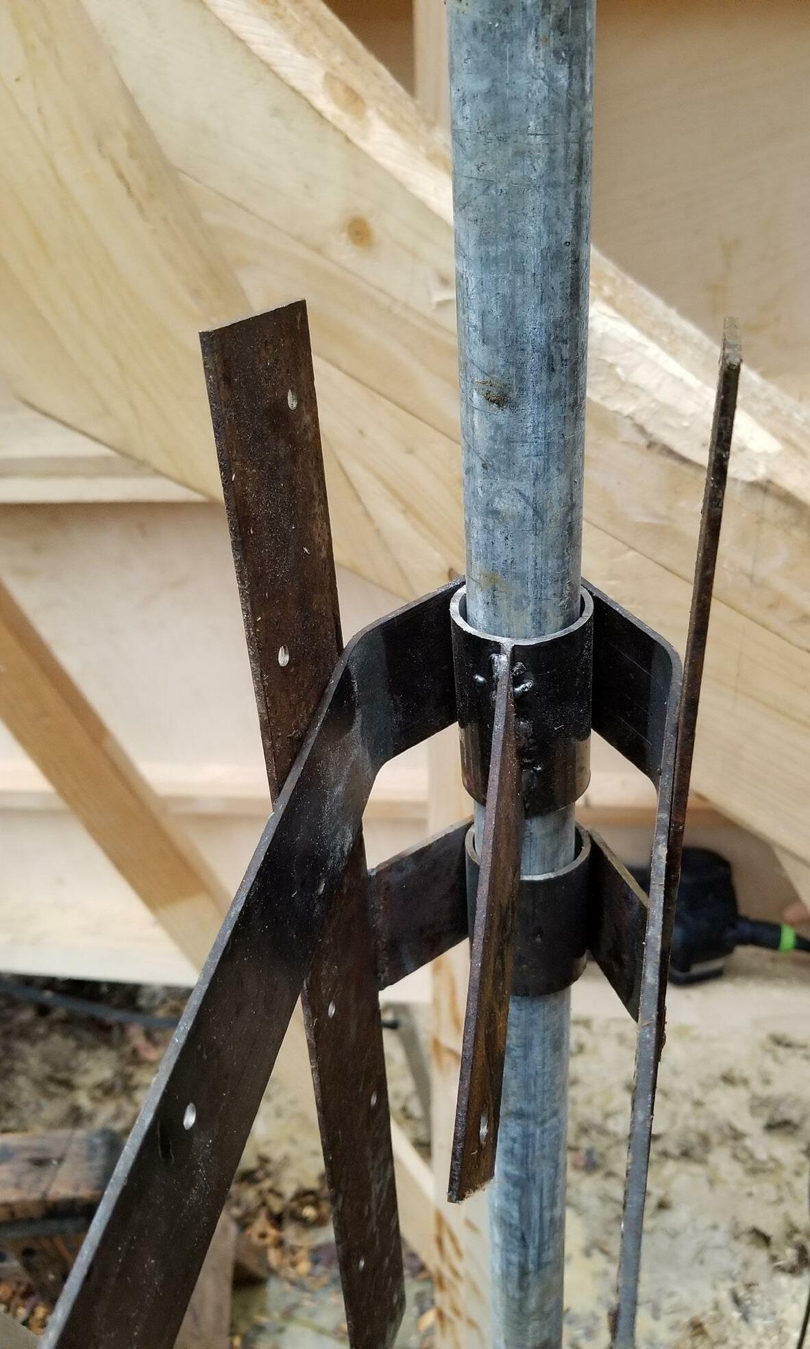 Three connector elements transfer the load of the ring beam to the trunks. Each was designed to provide a level interface and allow for adjustments during installation through. This hardware, with it’s protruding brackets, anticipates a future round of interior buildout.