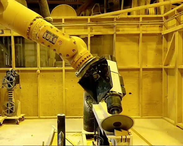 The panels were fabricated on the robot due to the nonrepeating nature of the envelope geometry, and the compound angles of cuts. A circular saw end e ector ripped the lightning joint and cross cut the mitered ends of each framing member. Plunge cuts on both ends form the keys for the miters. The battens are fabricated on a miter saw using instructions generated via a grasshopper script that facilitated the identi cation, logging, and cutting procedure of each piece.
