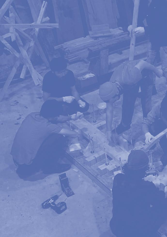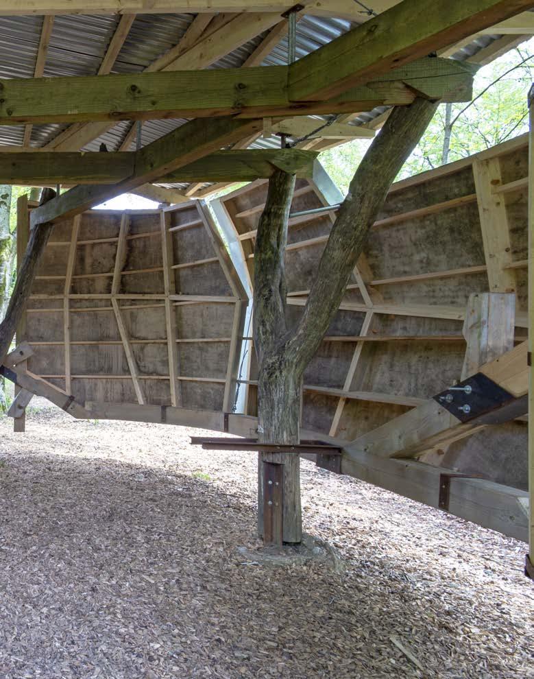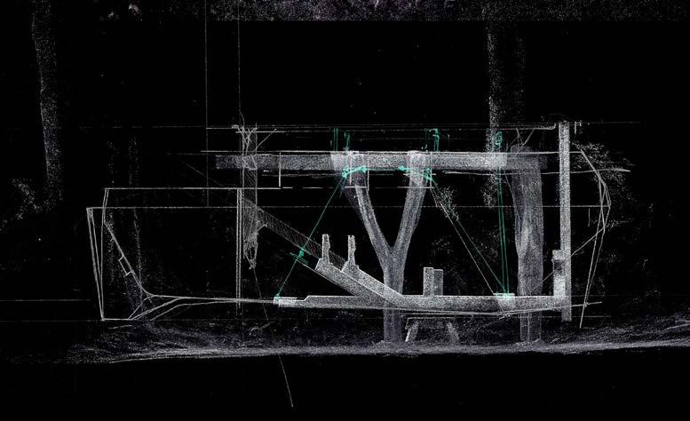The Ring Beam from Act II of the Foundry’s construction was the rst element to be incorporated into the primary structure. The orientation of the ring beam is determined by alignment to the three forked trunks which delineate a symmetrical axis that matched the geometry of the ring beam.