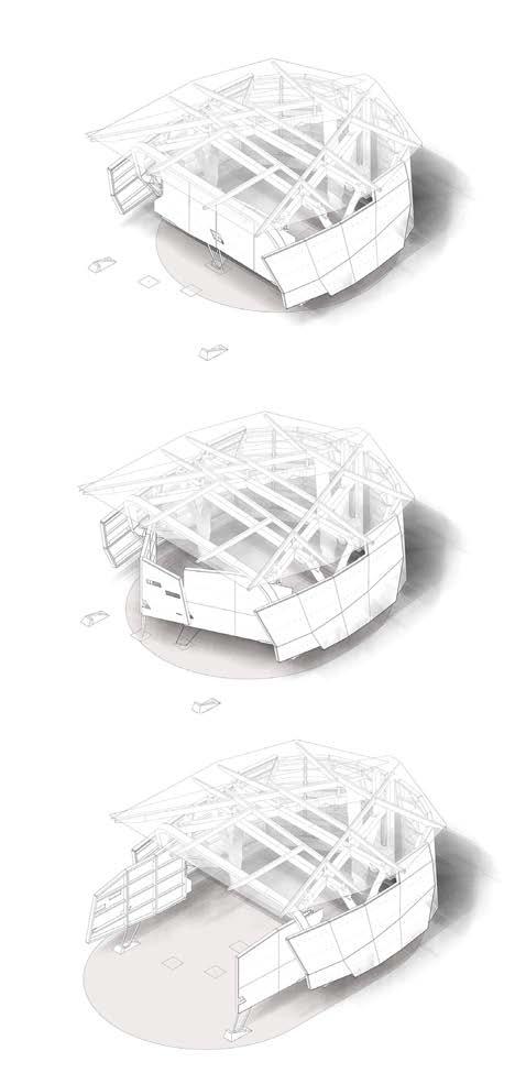 The west side face of the foundry is treated as a dynamic, operable wall that oats above the ground. This dynamic wall is divided into two dynamic wall components that allow three di erent con gurations as per the user’s needs. The rst con guration takes place when the space is not in use, suggesting a smaller territory for the foundry space while the second con guration of the doors suggests a ‘a private working mode’ that allows the user to expand the interior space. The third state suggests an ‘open up’ mode that allows the union of the foundry with the outdoor space serving workshops held in the foundry that demand a larger number of people. The change of state for the walls makes the space readable from the outside