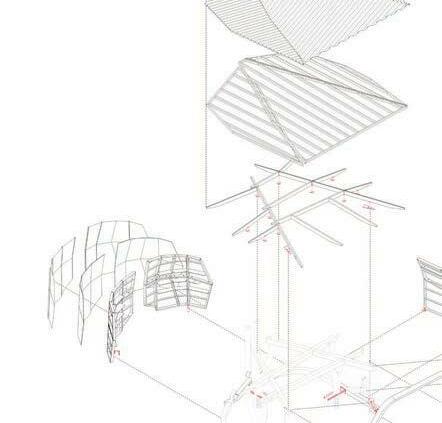 This exercise highlighted the contradictions between timber and aluminium: timber being a rigid material on the one hand, but easily manipulated on the other hand, and aluminium being harder to manipulate, but when it does it has exibility in the form it can take. This, along with the di erent properties of their depths and volumes are juxtaposed in the foundry to create a light-weight e ect for the structure.