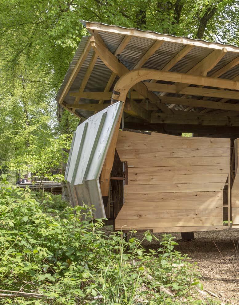 Aluminium cladding was designed to follow the geometry of the timber-built frames, to complement its complexity. The standard approach to standing seams was rethought in order to have a clean transition between surfaces of di erent angles, with oversized eaves to create a shadow gap and handle the water drippage without a need for gutters. Edges of the two side wings of the Foundry were designed to curve, so as to take advantage of the relative exibility of aluminium as a material.