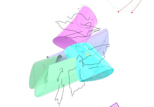 The project is a free form exploration where the data for the design is extracted from the infamous dance of Fred and Ginger to bring tensile mesh, clear acrylic and 3D printed plastic to achieve the final output