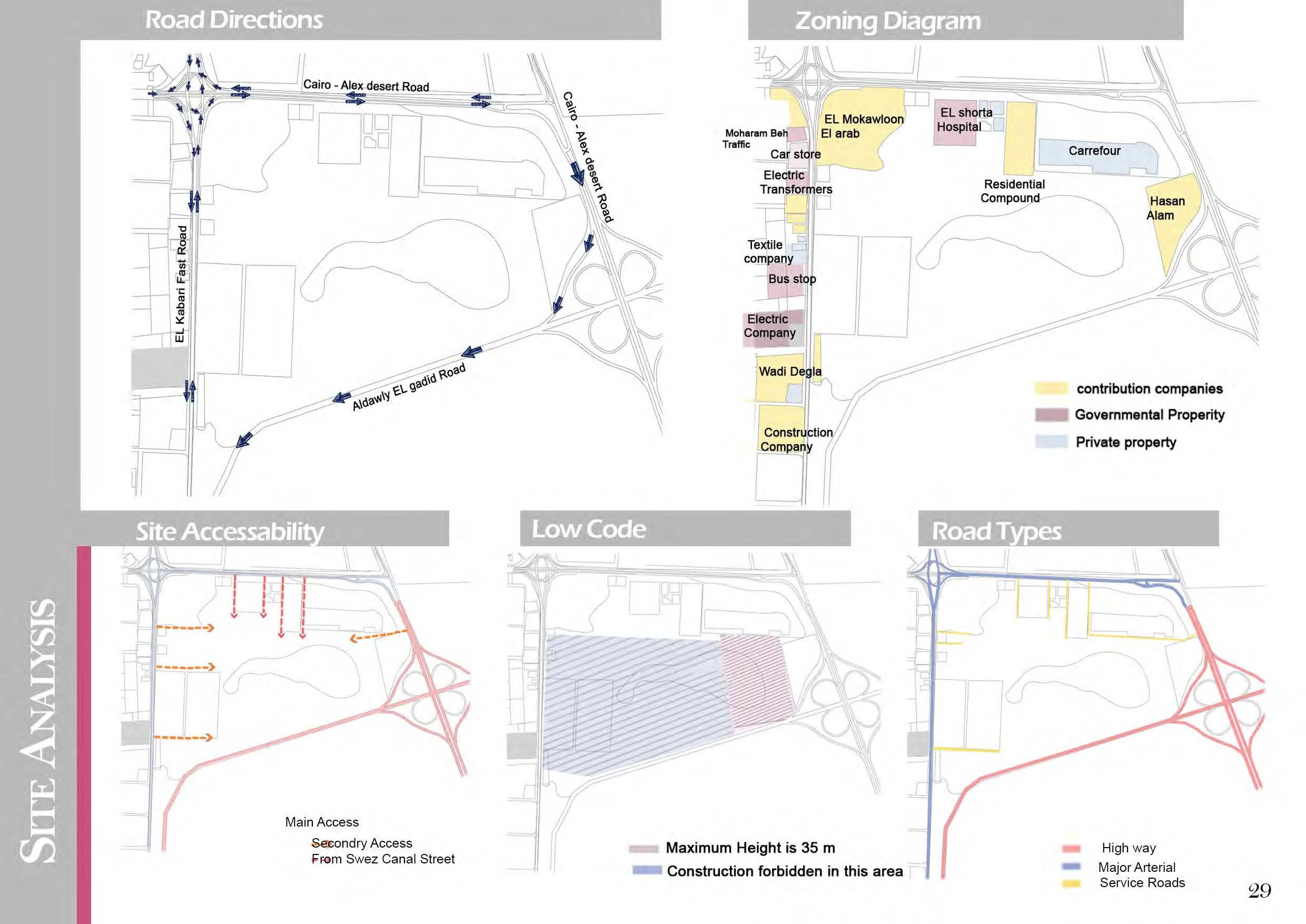 Road Directions • DOD DO Main Access Sel&ondry Access F ro m S w ez Cana l Street Low Code Zoning Diagram Maximum Height is 35 m Construction forbidden in this area Road Types contribution companies Governmental Properity Private property High w ay M ajor Arterial Service Roads 29