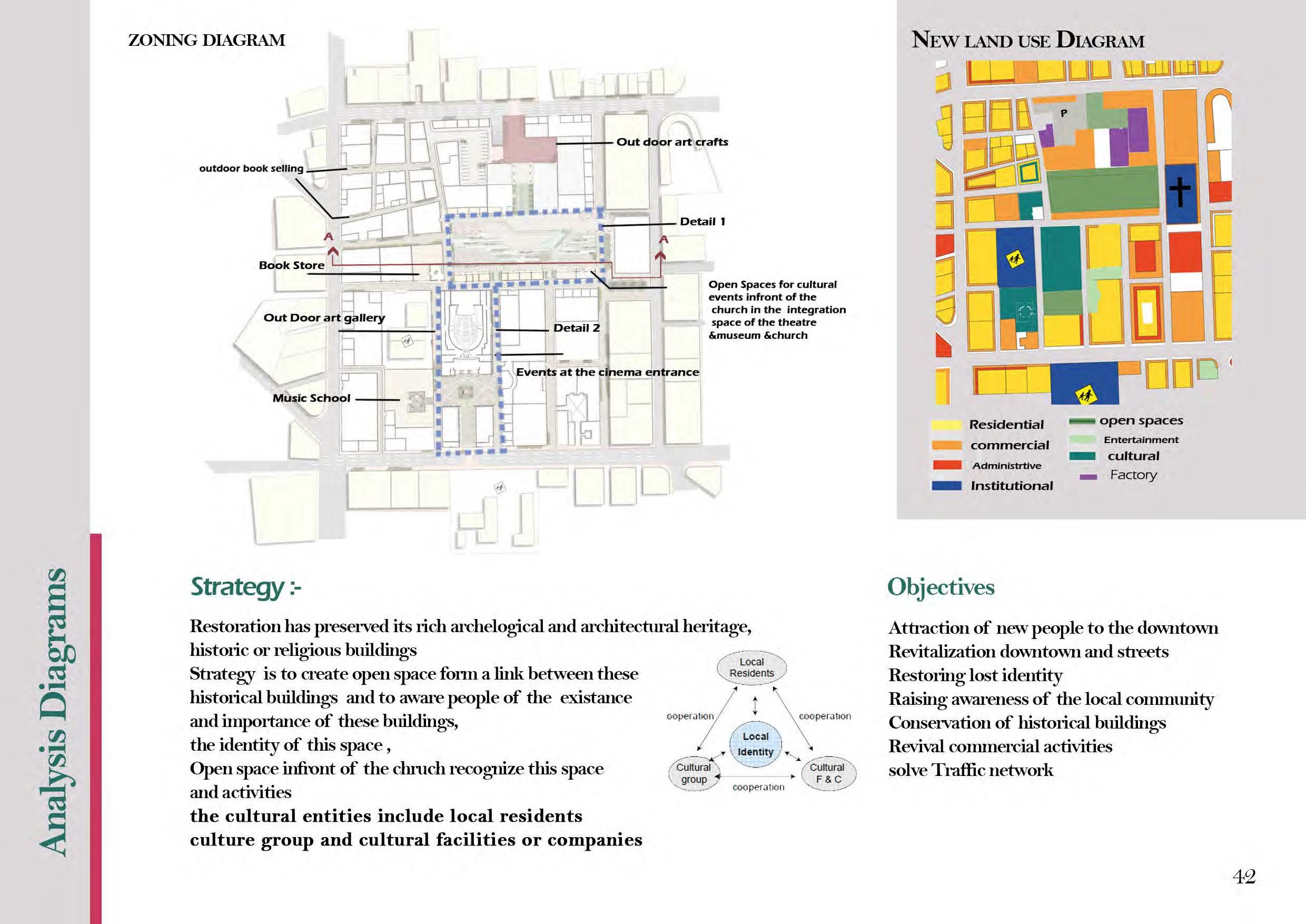 Restoration has preserved its tich archelogical and architectural heritage, historic or religious buildings Strategy is to create open space fom1 a link between these historical building'S and to a'vare people of the existance and iinportance of these buildings, the identity of this space , Open space in:fiunt of the chruch recognize this space and activities the cultural entities include local residents culture group and cultural facilities or companies