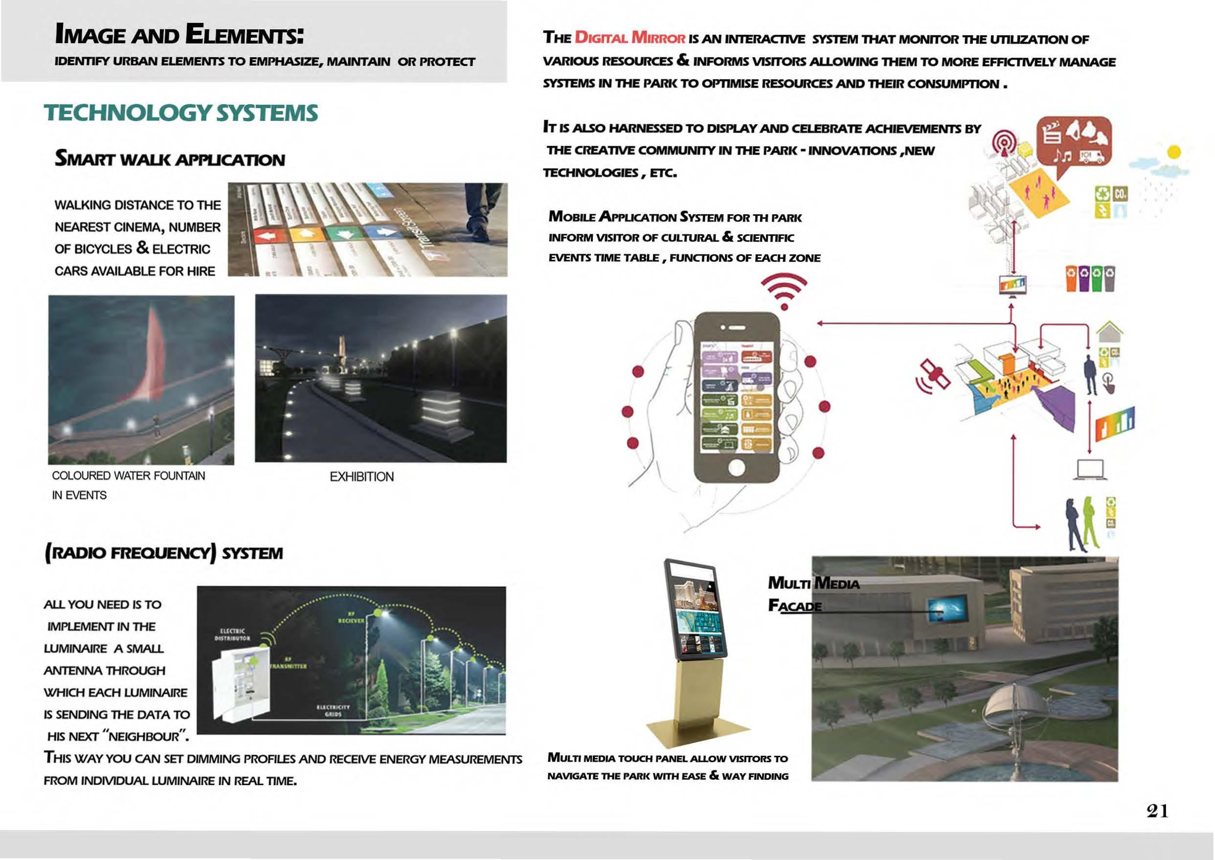 IMAGE AND ELEMENTS: IDENTlFY URBAN ELEMENTS TO EMPHASIZE, MAINTAIN OR PROTECT TECHNOLOGY SYSTEMS SMART WAU< APPIJCATION WALKING DISTANCE TO THE NEAREST CINEMA, NUMBER OF BICYCLES & ELECTRIC CARS AVAILABLE FOR HIRE COLOURED WATER FOUNTAI N IN EVENTS (RADIO FREQUENCY) SYSTEM AlL YOU NEED IS TO IMPLEMENT IN THE WMINAIRE A SMALL ANTENNA THROUGH WHICH EACH LUMINAIRE IS SENDING THE DATA TO IIII HIS NEXT NEIGHBOUR • EXHIBITION THIS WAY YOU CAN SET DIMMING PROALES AND RECENE ENERGY MEASUREMENTS FROM INDMDUAL LUMINAIRE IN REAL llME. THE DIGJTAL MIRROR 1s AN INTERACTJVE SYSTEM lMAT MONJTOR THE unUZAnoN oF VARIOUS RESOURCES & INFORMS VISfTORS AlLOWING THEM TO MORE EFFICTJVELY MANAGE SYSTEMS IN THE PARK TO OP11MISE RESOURCES AND THEIR CONSUMP110N • IT IS ALSO HARNESSED TO DISPLAY AND CELEBRATE ACHIEVEMENTS BY THE CREA11VE COMMUNnY IN THE PARK ·INNOVATIONS ,NEW TECHNOLOGIES, ETC. MoBILE APPuc.AllON SYSTEM FORTH PARK INFORM VISITOR OF CULTURAL & SCIENTIFIC EVENTS TIME TABLE, FUNCTIONS OF EACH ZONE • MuLn MEDIA TOUCH PANEL ALLOW VISITORS TO NAVIGATE llfE PARK wrrH EASE & WAY FINDING • • • • • 21