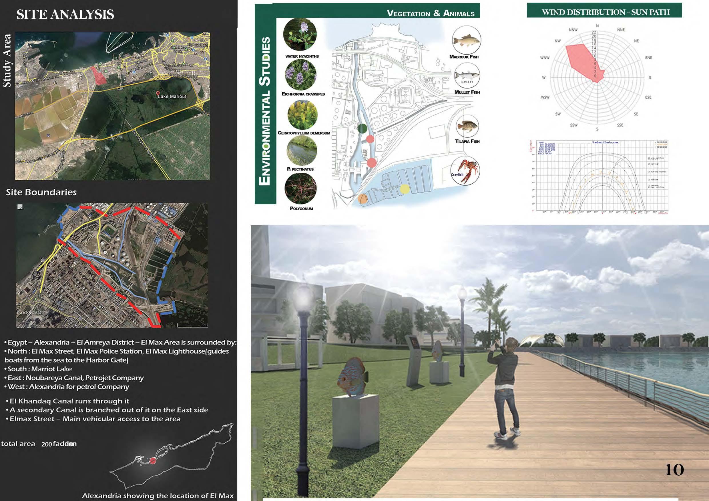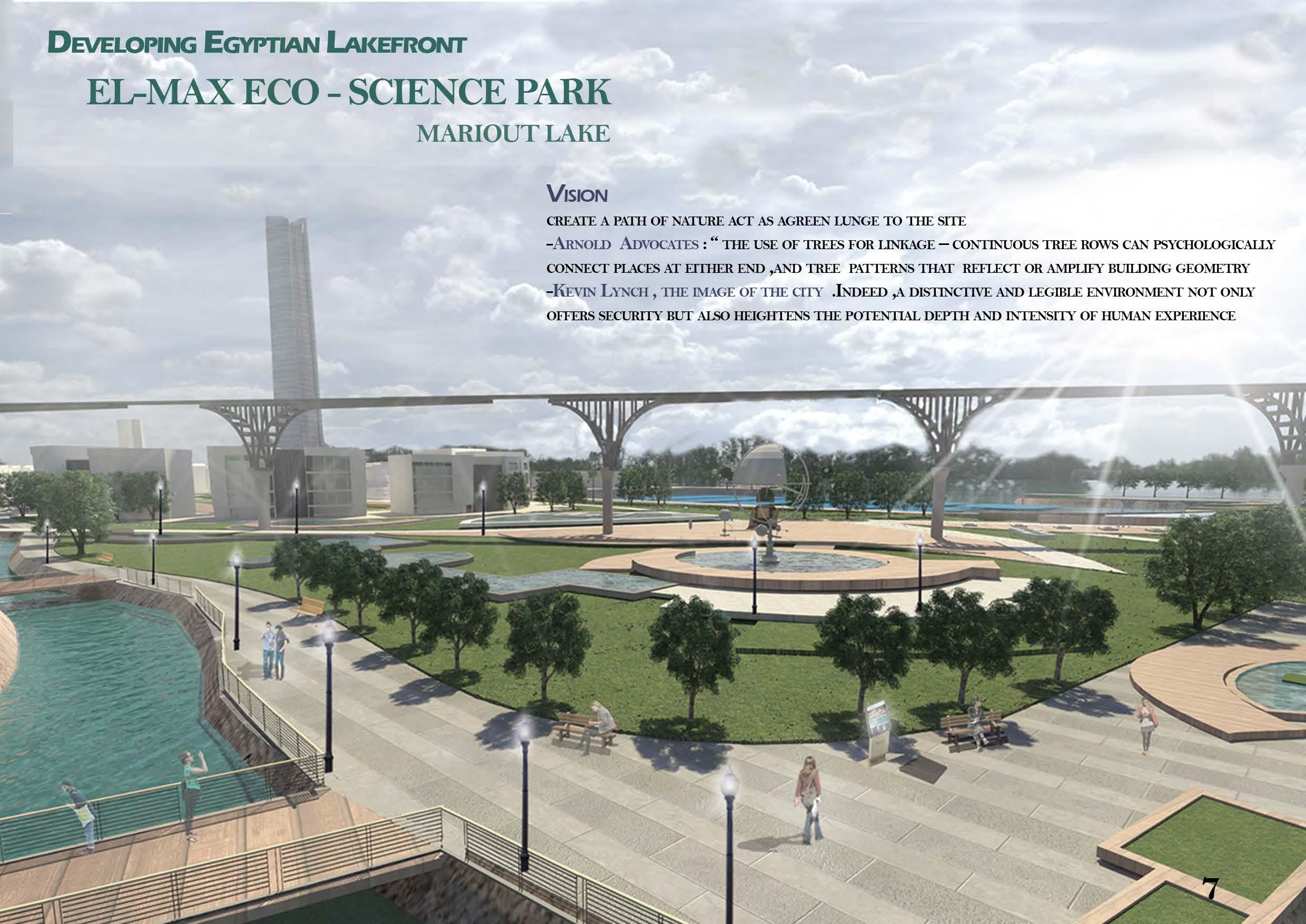 DEVELOPING EGYPTIAN LAI<EFRONT EL-MAX ECO- SCIENCE PARK MARlOUT LAKE VISION CREATE A PATII OF NATURE ACT AS AGREEN LUNGE TO THE SITE ARNOID ADVOCATES : "THE USE OF TREES FOR LINKAGE- CONTINUOUS TREE ROWS CAN PSYCHOWGICALLY C'ONNECT PlACES AT EITIIER END ,AND TREE PATTERNS THAT REFLECT OR AMPLIFY BUIIDING GEOlVIETRY KEVIN LYNCH , TilE IMAGE OF THE CITY .INDEED ,A DISTINCTIVE AND LEGffiLE ENVIRONMEl\lT NOT ONLY OFFERS SECURITY BUT ALSO HEIGHTENS THE POTENTIAL DEPTII AND ThrrENSITY OF HUMAN EXPERIENCE I