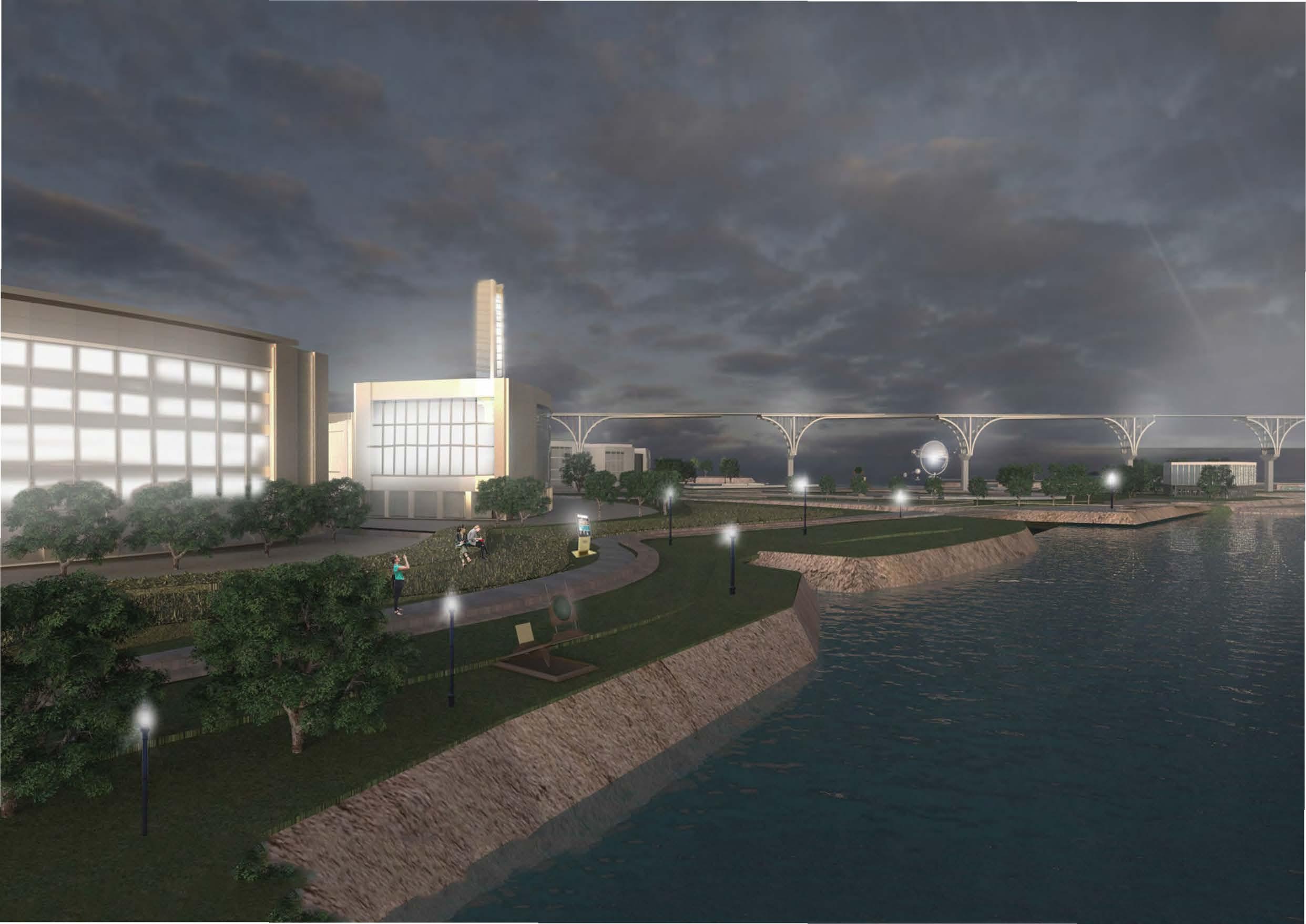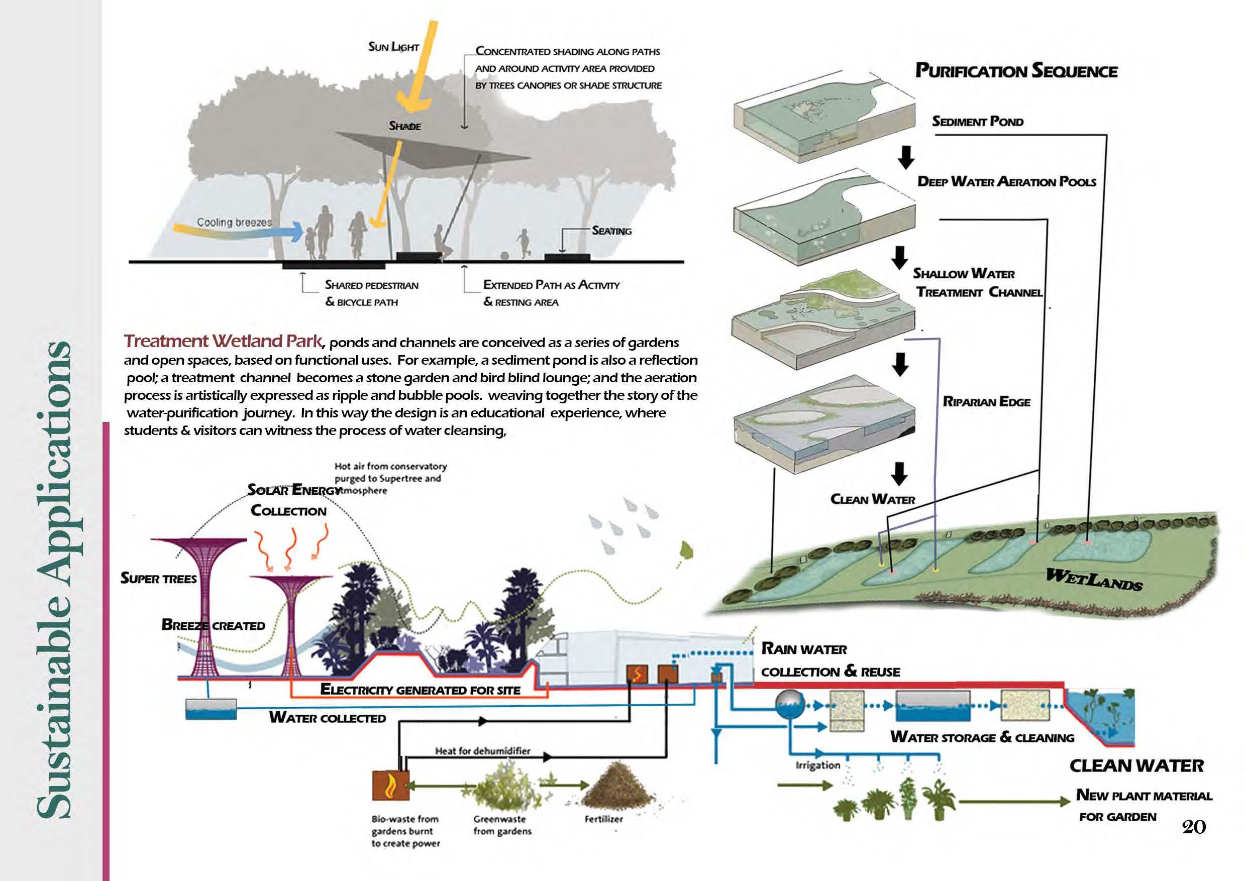 Treatment Wetland ponds and channels are conceived as a series of gardens and open spaces, based on functional uses. For example, a sediment pond is also a reflection pool; a treatment channel becomes a stone garden and bird blind lounge; and the aeration process is artistically expressed as ripple and bubble pools. weaving together the story of the water-purification journey. In this way the design is an educational experience, where students & visitors can witnes s the process of water cleansing, purged to