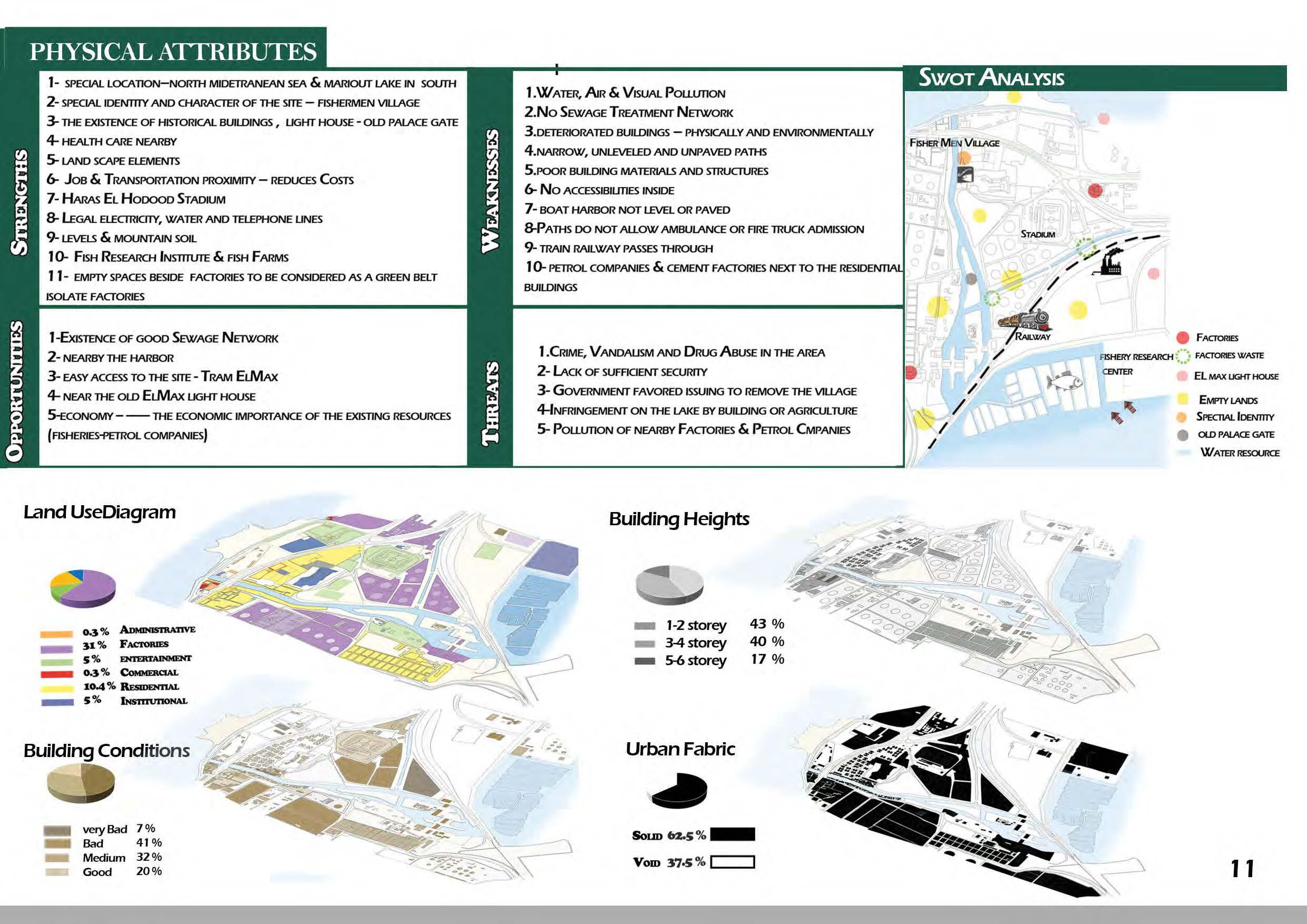 SPECIALIDEMTTY AND CHARACTER OF THE SITE- FISHERMEN VIllAGE 3- THE EXISTENCE OF HISTORICAL BUILDINGS, UGHT HOUSE- OLD PAlACE GATE CARE NEARBY 5- LAND SCAPE ELEMENTS 6- JoB & TRANSPORTATION PROXIMrTY- REDUCES Cosrs 7- HARAS EL HooooD STADIUM 8-l£GAL ELECTRICrTY, WATER AND TELEPHONE UNES 9- LEVELS & MOUNTAIN SOIL 10- FISH RESEARCH INSTITUTE & FISH FARMS 11- EMPTY SPACES BESIDE FACTORIES TO BE CONSIDERED AS A GREEN BELT ISOLATE FACTORIES