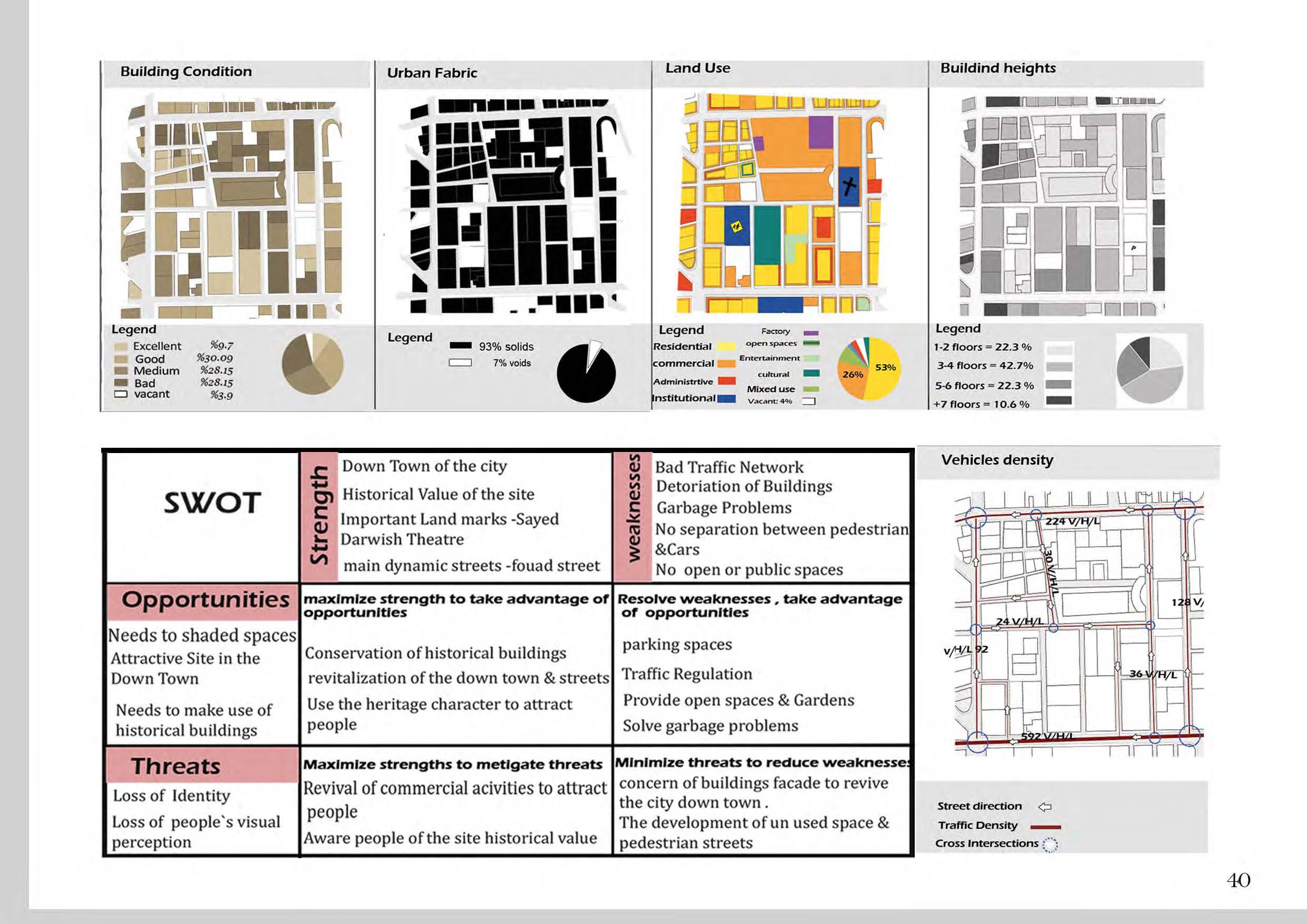 Building Condition L e gend Excellent Good Medium Bad D vaca n t 969-7 %30.09 %28.15 %28.15 %3-9 Urban Fabric L e gend 93%solids c=:J 7% voids Land Use Legend Resid e ntia com m e rcia Admlnlstrtlve Factory open spaces Enterta inment cu ltura l M ixed use nstitutiona l vacant: 4 % 2 6% SWOT .C Down Town of the city C, Historical Value of the site Important Land marks -Sayed l:; Darwish Theatre main dynamic streets -fouad street cu Bad Traffic Network Detoriation of Buildings Garbage Problems No separation between pedestrian &Cars No open or public spaces Opportunities maximize strength to take advantage of Resolve weaknesses, take advantage opportunities of opportunities Needs to shaded spaces Attractive Site in the Down Town Needs to make use of historical buildings Threats Loss of Identity Loss of people's visua l perception Conservation of historical buildings parking spaces revitalization of the down town & streets Traffic Regulation Use the heritage character to attract people Maximize strengths to metrgate threats Revival of commercial acivities to attract people Aware people of the site historical value Provide open spaces & Gardens Solve garbage problems Mfnfmlze threats to reduce weaknesse concern of buildings facade to revive the city down town. The development of un used space & pedestrian streets Buildind heights L e gend 1-2 fl oor s= 22.3% 3-4 fl oors = 42.7% 5-6 flo ors = 22.3 % +7floors= 10 6% Vehicles density Street dire ction ¢ Traffic D e n sity C ross Inte r sections .. ""\ 40
