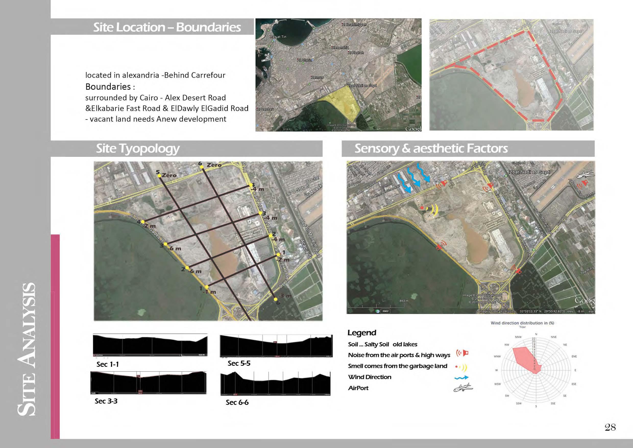 Sitelocation-Boundaries located in alexandria -Behind Carrefour Boundaries: surrounded by Cairo- Alex Desert Road &Eikabarie Fast Road & EIDawly EIGadid Road -vacant land needs Anew development SiteTyopology ·-- -· Sec 1-1 Sec 5-S Sec 3-3 Sec 6-6 Sensory&aestheticFactors Legend Soil ... Salty Soil old lakes Noise from the air ports & high ways (< ' Smell comes from the garbage land • • )) Wind Direction AirPort W1nd directiOn d1stribut1on 10 00 Y•u SS\\ SSl s 28