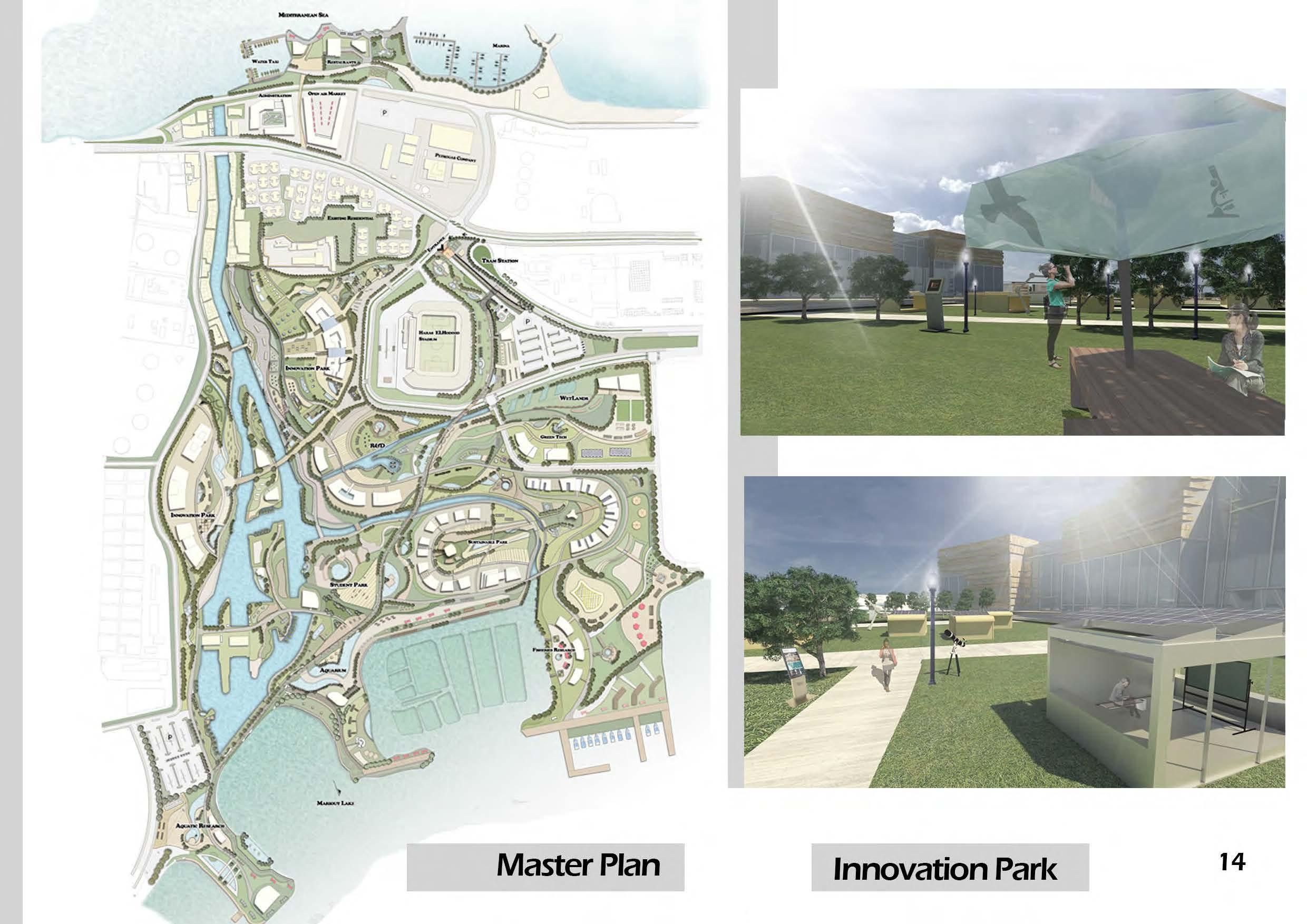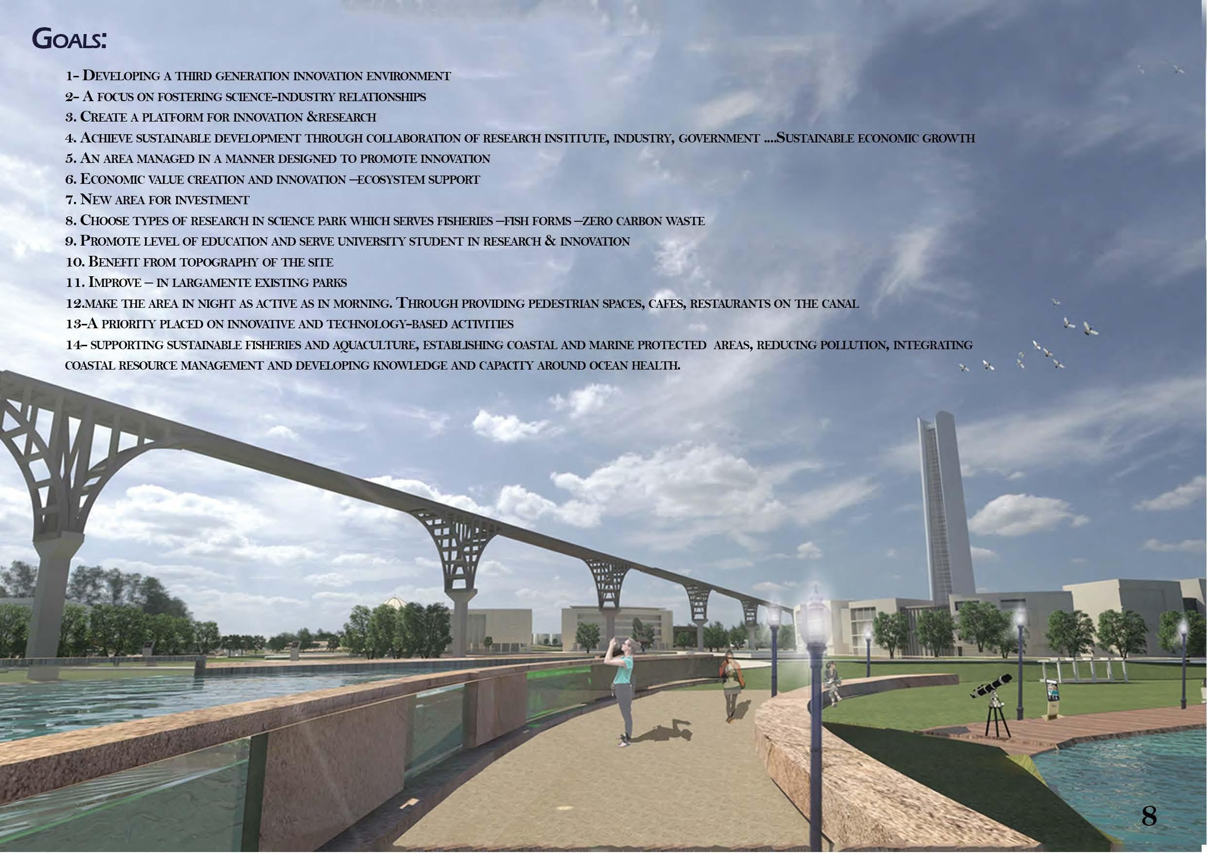 GoALS: 1- DEVELOPING A TillRD GENERATION INNOVATION ENVIRONMENT 2- A FOCUS ON FOSTERING SCIENCE-INDUSIRY REIATIONSlllPS 3. CREATE A PIAIFORM FOR INNOVATION &RESEARUI 4. ACHIEVE SUSTAINABLE DEVELOPMENT THROUGH C'OUABORATION OF RESEARUI INS'ITIUTE, INDUS'IRY, GOVERNMENT •••.SUSTAINABLE ECONOMIC GROWill 5. AN AREA MANAGED IN A MANNER DESIGNED TO PROMOTE INNOVATION 6. ECONOMIC VALUE CREATION AND INNOVATION -ECOSYSTEM SUPPORT 7. NEW AREA FOR INVESTMENT 8. CHOOSE TYPES OF RESEARUI IN SCIENCE PARK WinCH SERVES FISHERIES -FISH FORMS -ZERO CARBON WASTE 9. PROMOTE LEVEL OF EDUCATION AND SERVE UNIVERSITY STUDENT IN RESEARUI & INNOVATION 10. BENEFIT FROM TOPOORAPHY OF TilE SITE 11. IMPROVE- IN LARGAMENTE EXISTING PARKS 12.MAKE TilE AREA IN NIGHT AS ACTIVE AS IN MORNING. THROUGH PROVIDING PEDESTRIAN SPACES, CAFES, RESTAURANIS ON TilE CANAL 13-A PRIORITY PLACED ON INNOVATIVE AND TECHNOLOGY-BASED ACTIVITIES 14- SUPPORTING SUSTAINABLE FISHERIES AND AQUACULTIJRE, ESTABLISHING COASTAL AND MARINE PROTECIED AREAS, REDUCING POILUllON, INTEGRATING COASTAL RESOURCE MANAGEl\1ENT M'D DEVELOPING KNOWLEDGE AND CAPACITY AROUND OCEAN HEALTIL