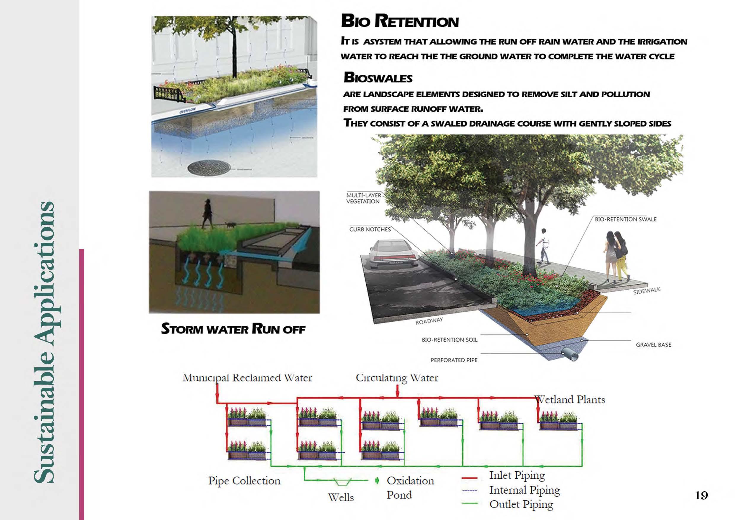 STORM WATER RuN oFF lVlutu al Keclrumed \\ 'a ter Pipe Collection Bto RETENTION fT IS ASYSTEM THAT AU.OWING lHE RUN OFF RAIN WATER AND lHE IRRIGATION WATER TO REACH lHE lHE GROUND WATER TO COMPLETE lHE WATER CYCLE 8JOSWALES ARE LANDSCAPE ELEMENTS DESIGNED TO REMOVE SILT AND POU.UnON FROM SURFACE RUNOFF WATER. THEY CONSIST OF A SWALED DRAINAGE COURSE WITH GENTLY SLOPED SIDES \\ells BIO·RETENTION SOIL PERFORATED PIPE Cuculat1ng \\ 'ater • Oxidation Pond - I nlet Piping I nternal P iping Outlet P iping GRAVEL BASE 19