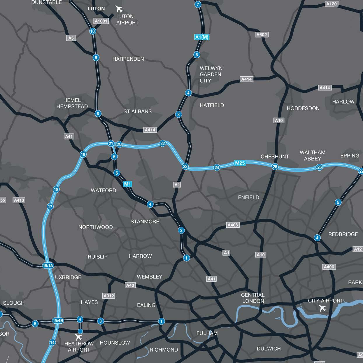 OMA V is conveniently located alongside the M25 between junctions 21 and 22; 3.5 miles and 3.6 miles away. Radlett station is 2 miles to the south, offering rail links via Thameslink into St Pancras International in 26 minutes.