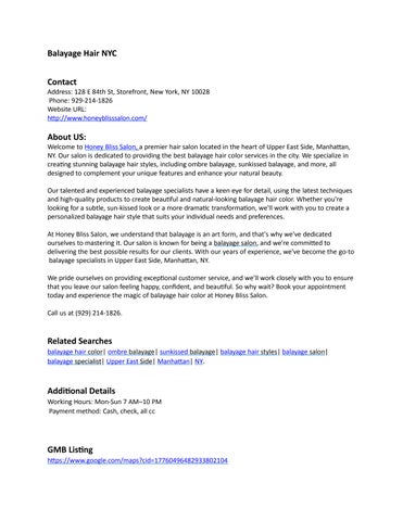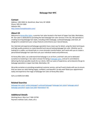 Phone: 929-214-1826 About US Welcome to Honey Bliss Salon, a premier hair salon located in the heart of Upper East Side, Manhattan, NY. Our salon is dedicated to providing the best balayage hair color services in the city. We specialize in creating stunning balayage hair styles, including ombre balayage, sunkissed balayage, and more, all designed to complement your unique features and enhance your natural beauty. Our talented and experienced balayage specialists have a keen eye for detail, using the latest techniques and high-quality products to create beautiful and natural-looking balayage hair color. Whether you're looking for a subtle, sun-kissed look or a more dramatic transformation, we'll work with you to create a personalized balayage hair style that suits your individual needs and preferences. At Honey Bliss Salon, we understand that balayage is an art form, and that's why we've dedicated ourselves to mastering it. Our salon is known for being a balayage salon, and we're committed to delivering the best possible results for our clients. With our years of experience, we've become the go-to balayage specialists in Upper East Side, Manhattan, NY. We pride ourselves on providing exceptional customer service, and we'll work closely with you to ensure that you leave our salon feeling happy, confident, and beautiful. So why wait? Book your appointment today and experience the magic of balayage hair color at Honey Bliss Salon. Call us at (929) 214-1826. Related Searches balayage specialist, balayage salon, sunkissed balayage, balayage hair color, ombre balayage, balayage hair styles, Upper East Side, Manhattan, NY. Additional Details Working Hours: Mon-Sun 7 AM–10 PM Payment method: Cash, check, all cc GMB Listing https://www.google.com/maps?cid=17760496482933802104