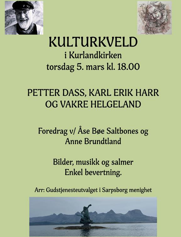 På kulturkvelden i Kurlandkirken torsdag 5. mars skal vi bli kjent med Petter Dass sitt liv og forfatterskap. Petter Dass var sønn av en rik skotsk handelsmann og tilhørte overklassen. Likevel ble han en folkets mann. Han fartet rundt mellom holmer og skjær og støttet folk i deres liv og levnet. Hans hovedverk er Katekismussangene og Nordlands Trompet. Folk flest kunne ikke lese på den tiden, så han skrev troslære på rim
