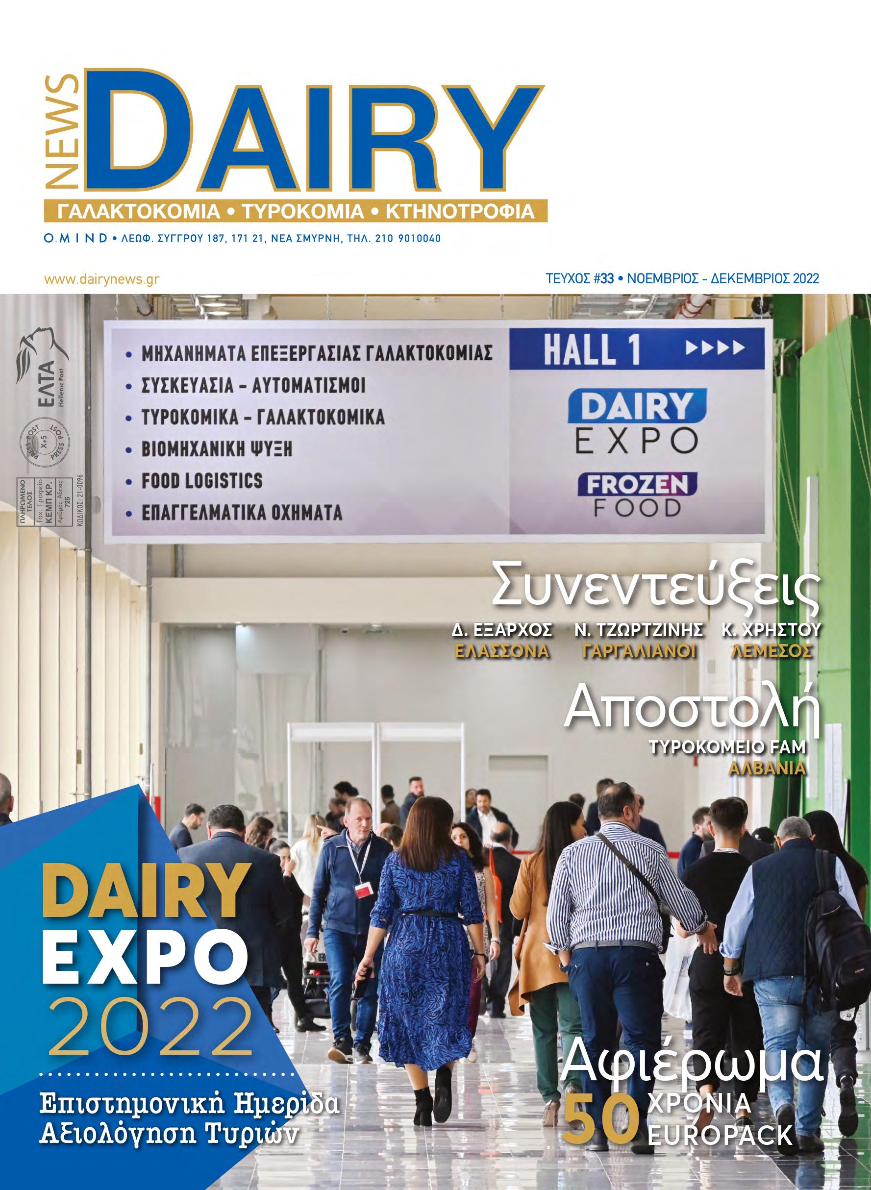 DAIRY NEWS • ΤΕΥΧΟΣ 33 • ΝΟΕΜΒΡΙΟΣ - ΔΕΚΕΜΒΡΙΟΣ 2022 Συνδρομές εσωτερικού: 1 έτος (6 τεύχη) 30 € Συνδρομές εξωτερικού-Κύπρος: 1 έτος (6 τεύχη) 70 € Παραγωγή: O.MIND Creatives Κωδ. Εντύπου: 21-0096ISSN: 2585-206X Σημείωση: Οι απόψεις των αρθρογράφων και των συνεντευξιαζόμενων δεν εκφράζουν απαραίτητα τις απόψεις του περιοδικού. Εκτύπωση - Βιβλιοδεσία: Pressious Arvanitidis ΝΕΑ Κλάδοι, αγορές, πρόσωπα & θεσμοί 10