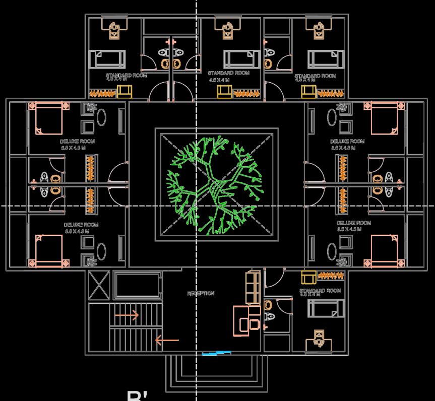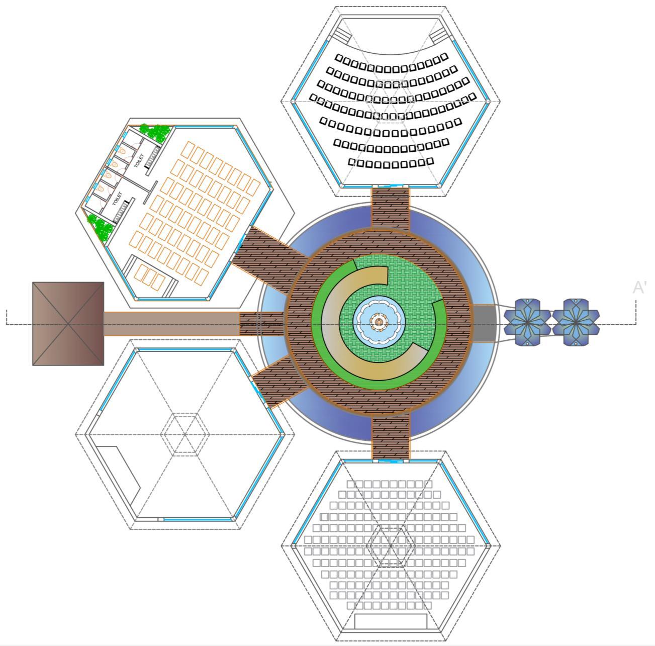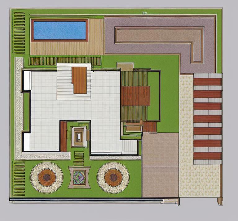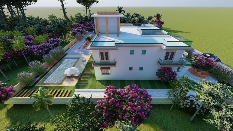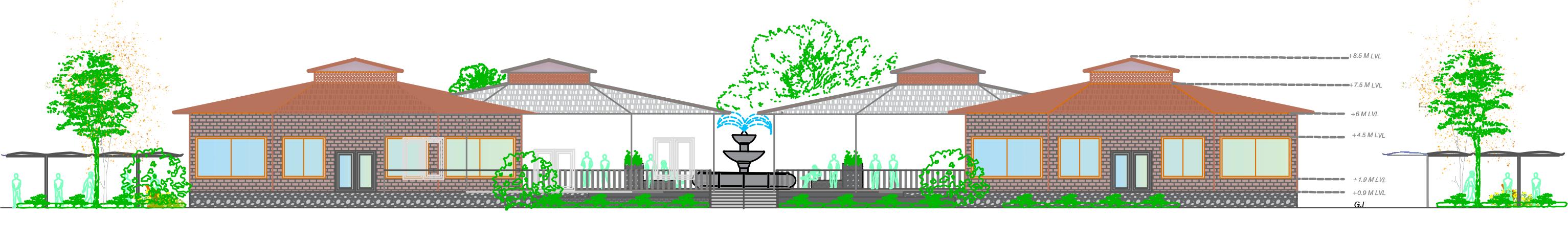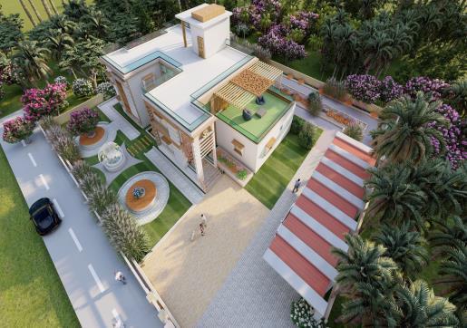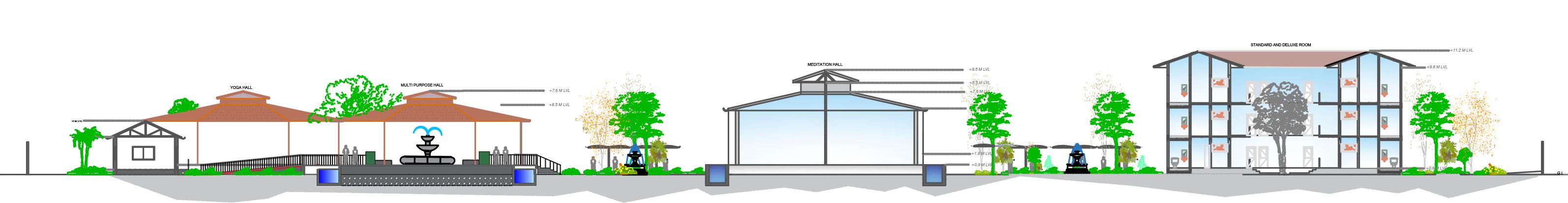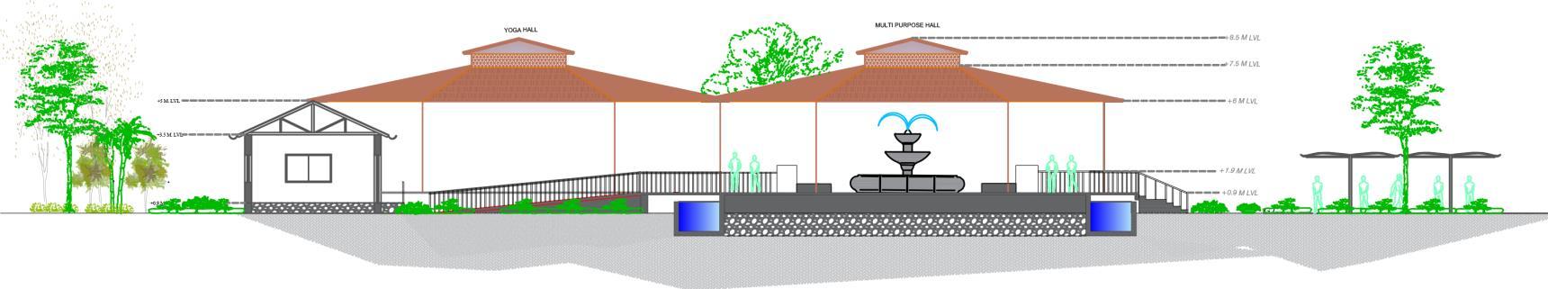 • Meditation and Yoga pavilion, on the upper level, has large openings on the east that allows natural sunlight to create a powerful setting for the Yoga sessions at sunrise.