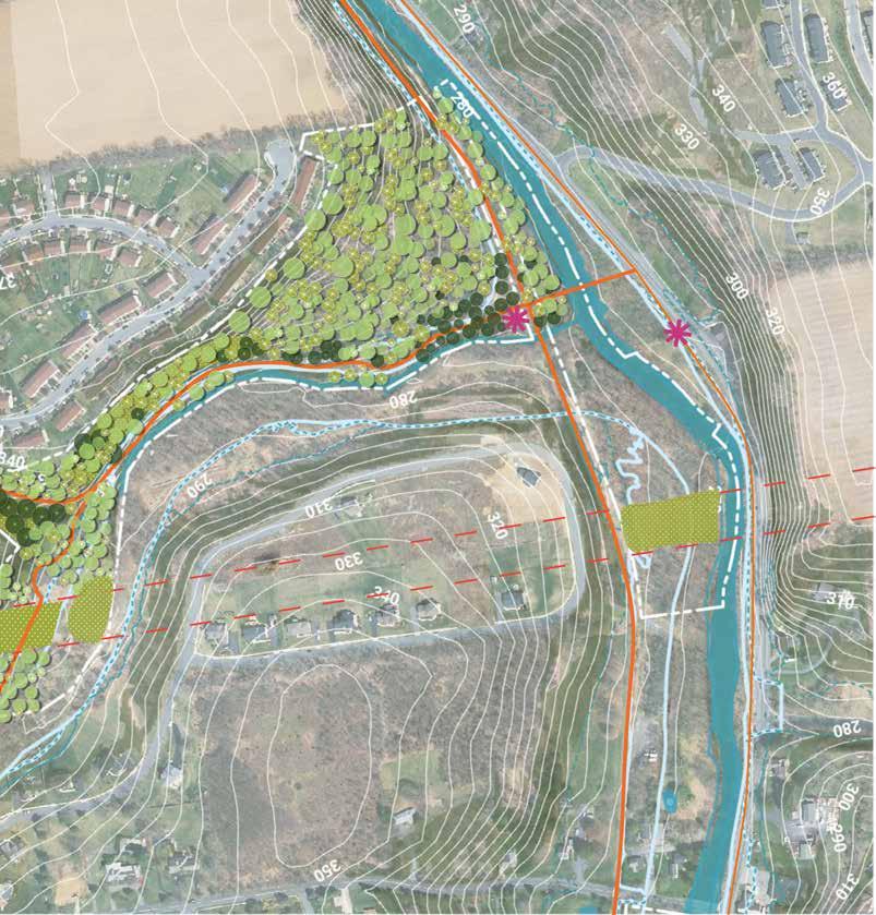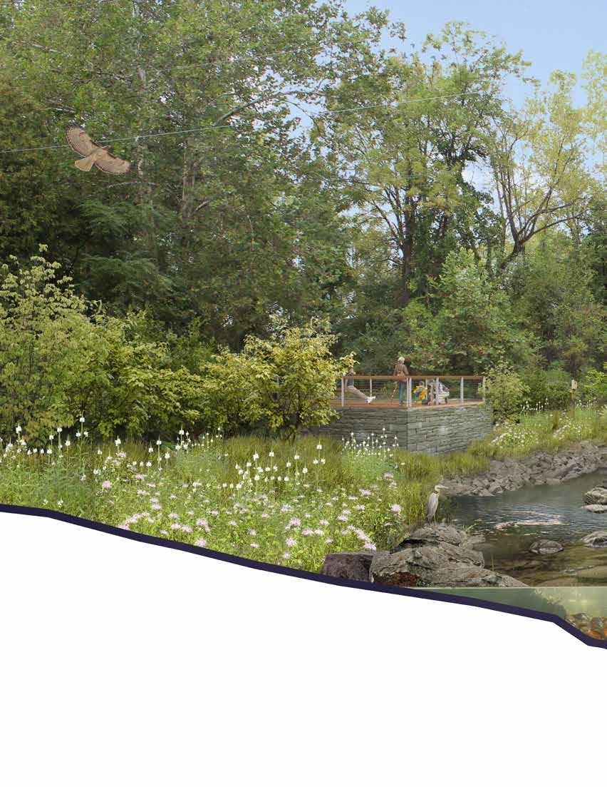 As a vision that engages with the uncertainty of climate change impacts, this report outlines various strategies to plan for the protection of ecosystems and beloved experiences along the Bushkill. The plan introduces ecological typologies and strategies to ameliorate compacted soils, habitat loss, invasive or degraded tree canopy, erosion, and pollution through various strategies: