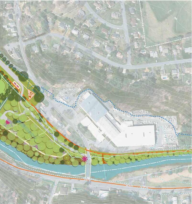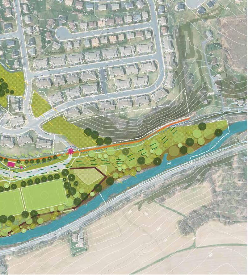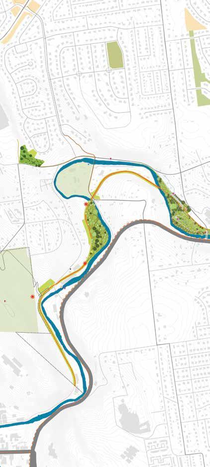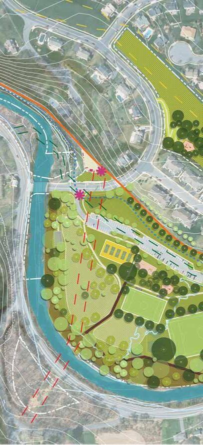 Pump Park address these concerns through circulation, restoration of natural plant habitat, consolidation of seating areas, and removing Dam No. 6. The concept also addresses the ongoing loss of play safety surfacing by raising the play area out of the 100-year floodplain.