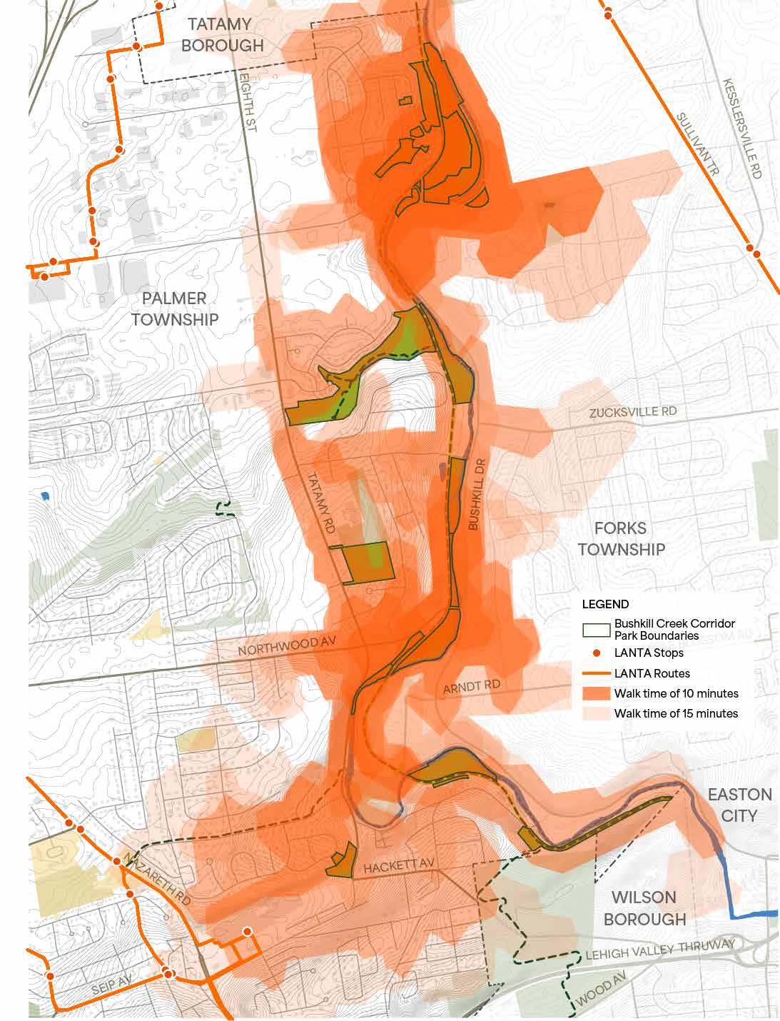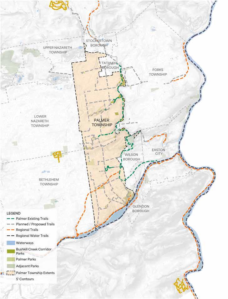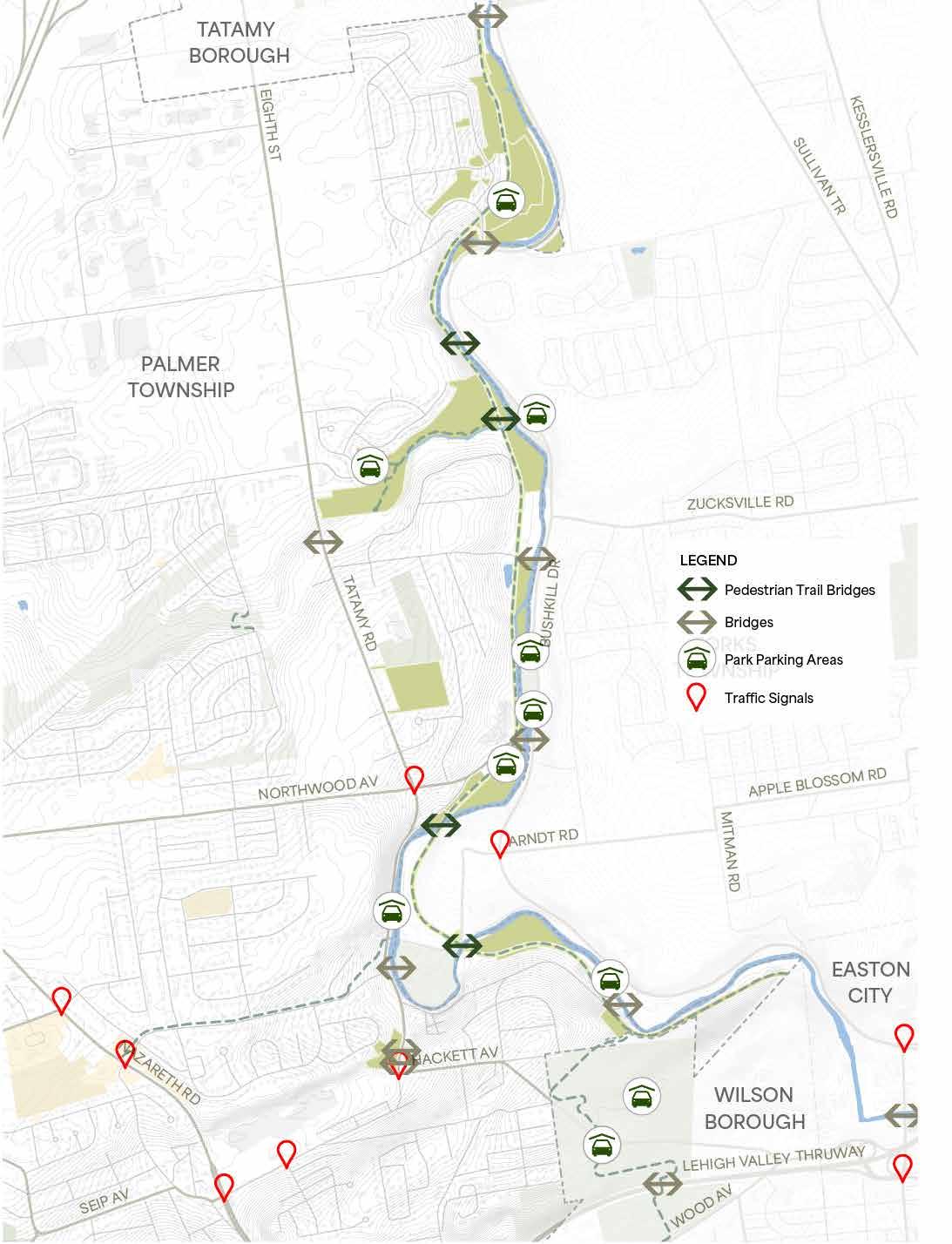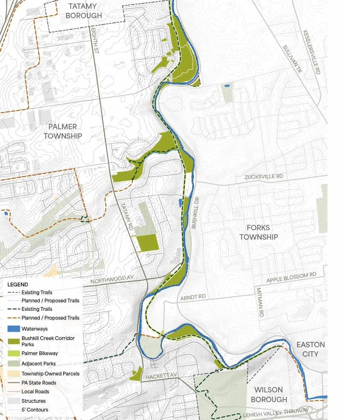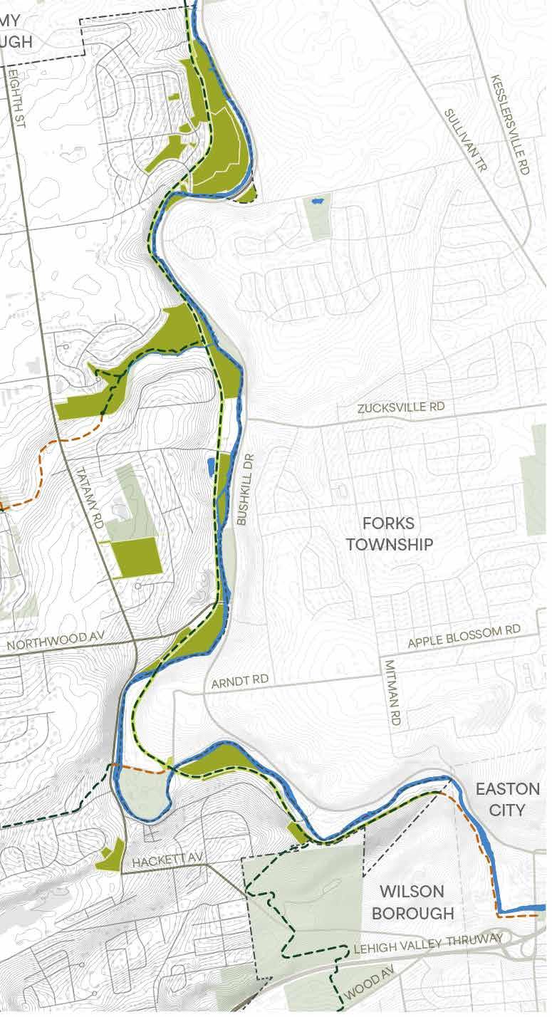 The Bushkill Creek Greenway is primarily centered in Palmer Township, with important connections to Tatamy Borough, Forks Township, and the City of Easton. This master plan, along with a simultaneous Easton-Palmer-Forks Regional Multimodal Trail Plan by Lafayette College, will establish the Greenway as an ecological connector than spans multiple municipalities. Multi-jurisdictional imagination and cooperation will bring about connected, livable landscapes that serve all residents, locally and regionally.