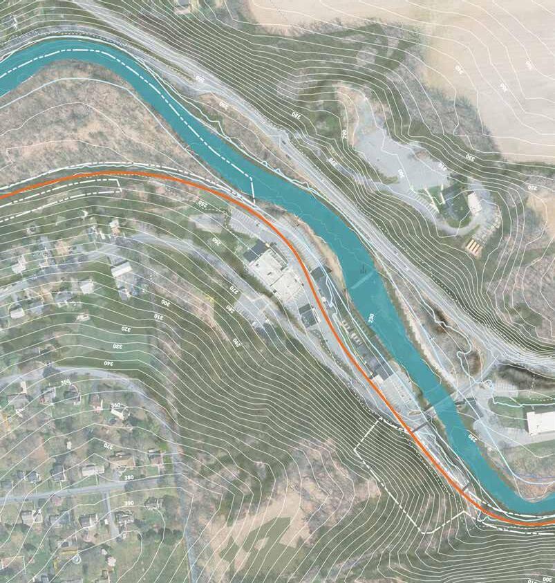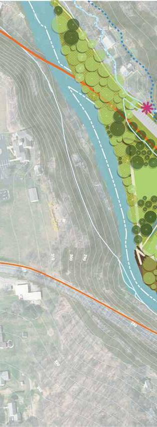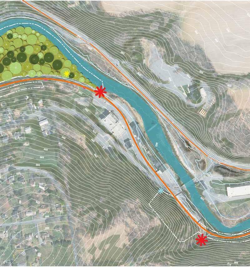 • Re-interpretation of historic elements such as Dam 6, into a usable fishing overlook that integrates historic signage and elements